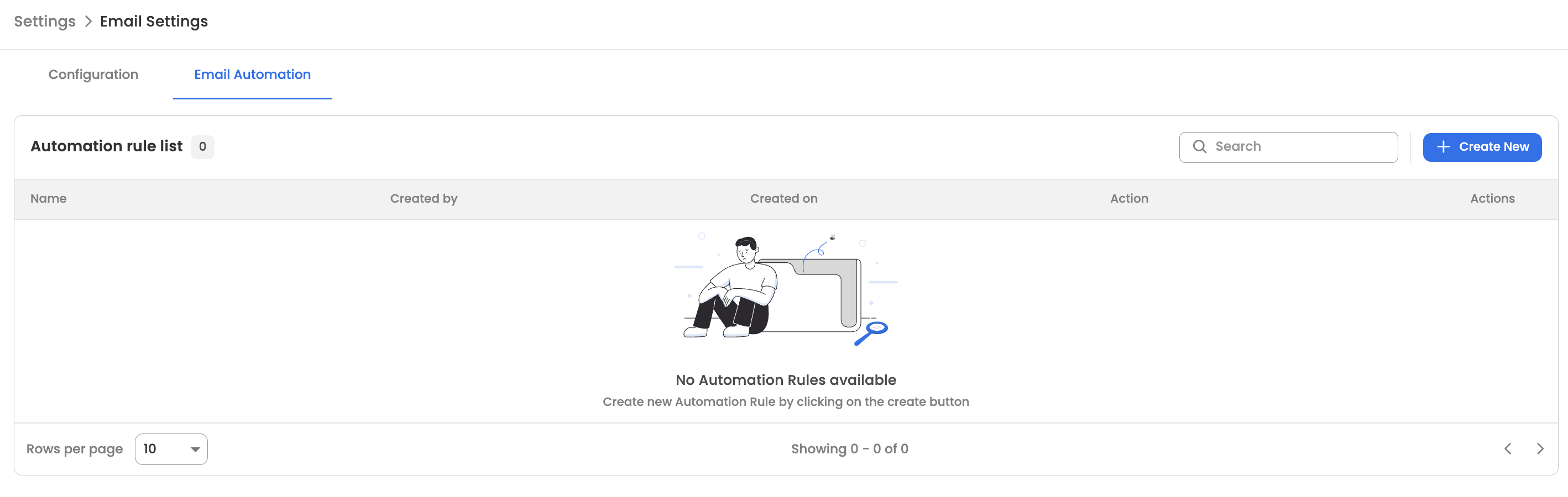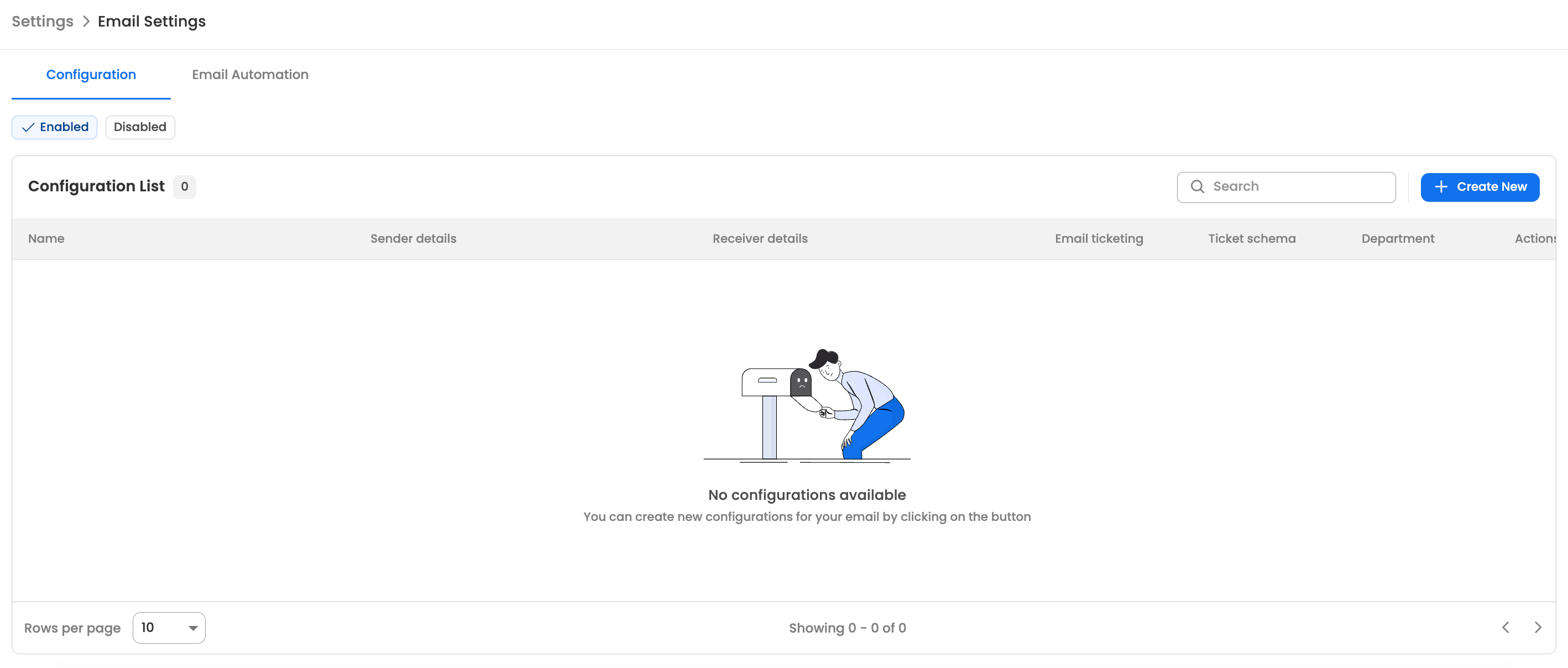 Users will have to create an email configuration by clicking on the "Create New" button