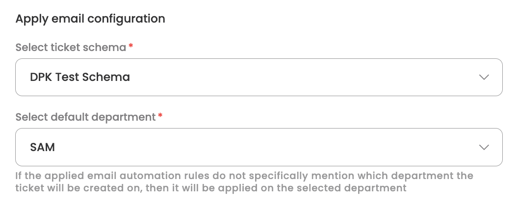 Customers can create multiple such email configurations and apply it for different schemas as per the use case. For eg., if the HR and IT departments want different emails for email ticketing then something like [email protected] and [email protected] will have to be configured and each will have to be associated with different ticket schemas.