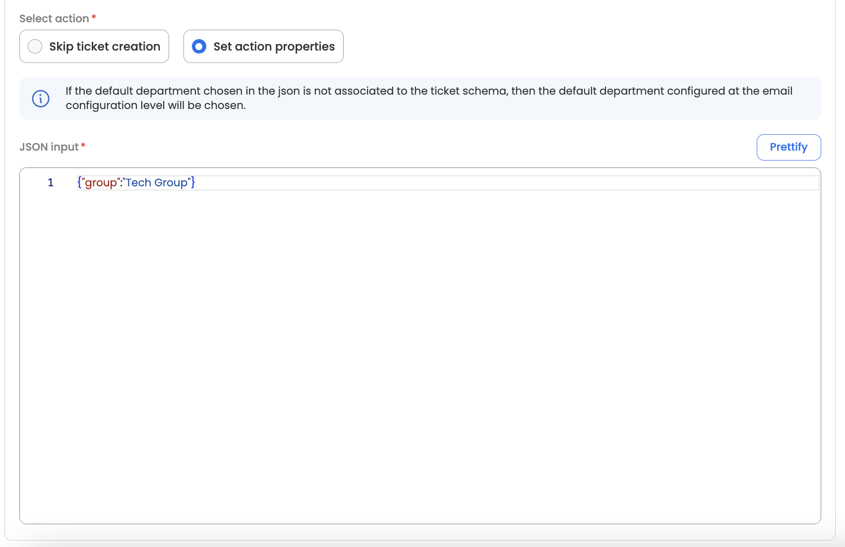 - Set Action properties: Lastly, based on whether the specified condition matches, if we want more operations to be performed on the subsequent ticket that is created, then that is also defined in the Json input here-