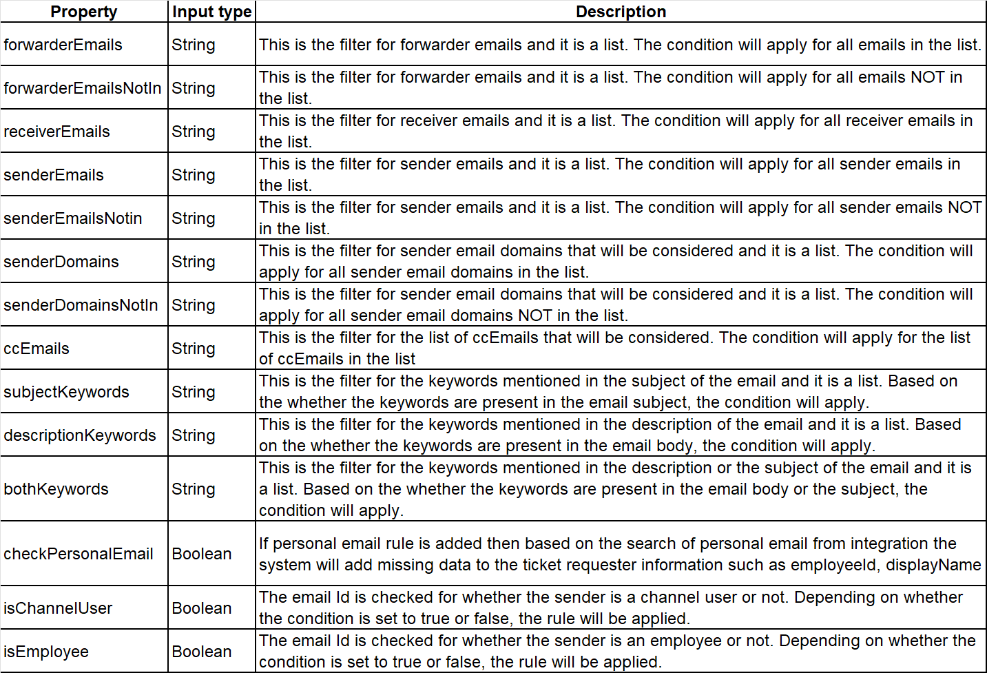 - UserActionProperties: Here, based on the whether the rules match in the previous section, user properties can be added to the email ticket that is being created. Which properties need to be added is again defined as a key value pair Json input.