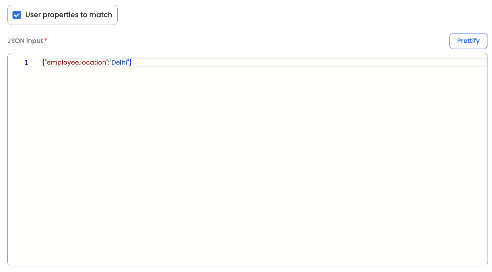 Additionally, "User properties to match" can be added in case user field conditions from the employee master data needs to be included. Here, we have provided the Json input where the key value pair can be added.
