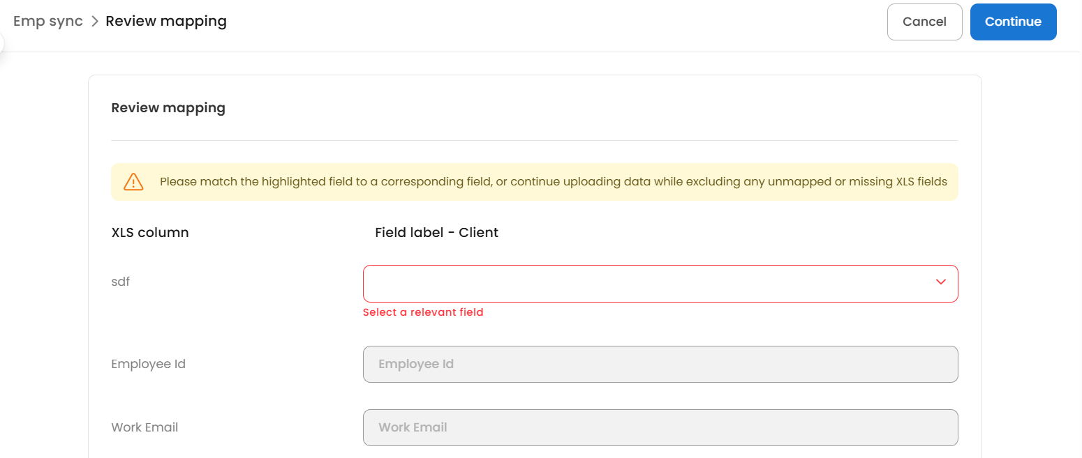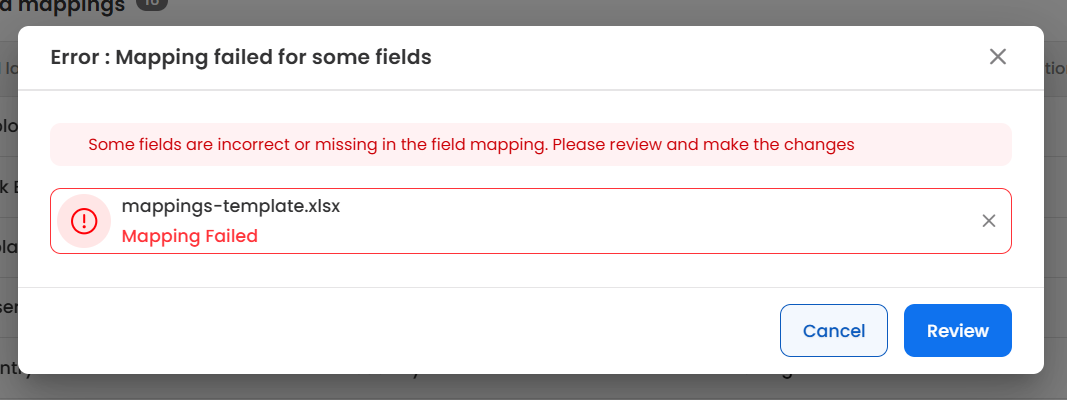 - Remap fields: If column headers didn't match your mapping, use the Review Mapping interface to manually link columns to Leena fields for this specific upload.
