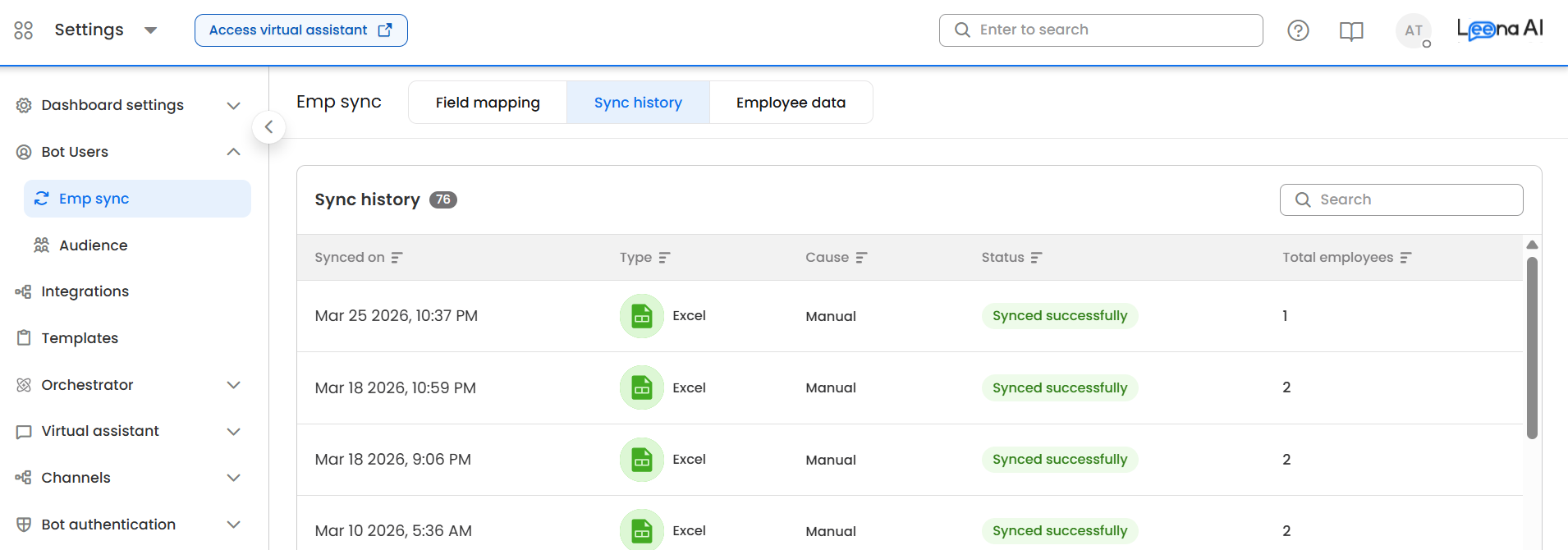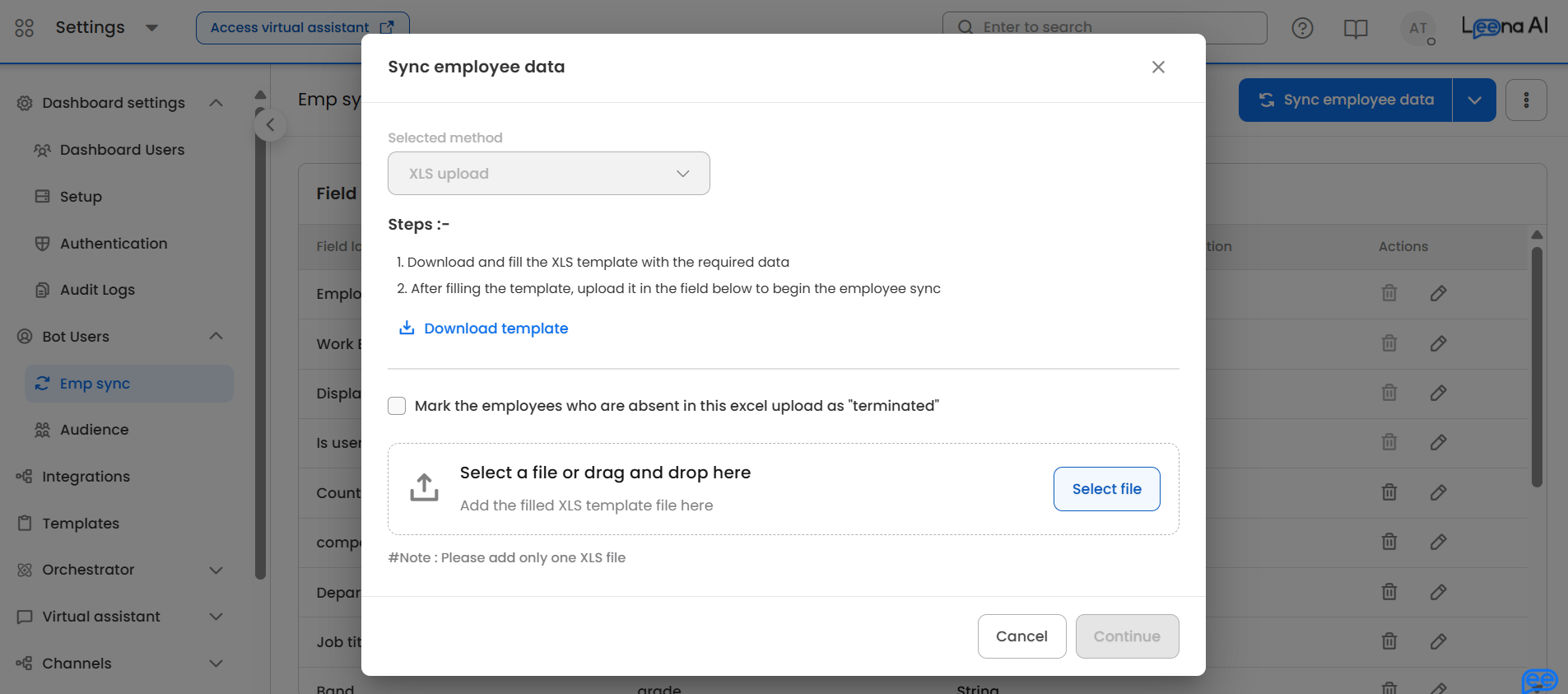 Employee Sync via Excel allows you to keep your employee list in Leena AI aligned with your source system by uploading a spreadsheet file (.xls, .xlsx, or .csv) containing employee data.