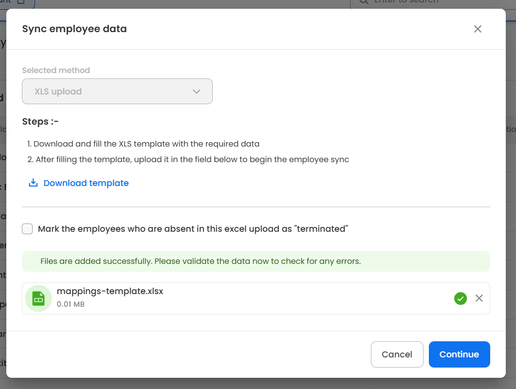 - Check the "Terminate absent employees" option — If enabled, any employees currently in Leena AI who are not present in your uploaded file will be marked as Terminated after the sync completes.