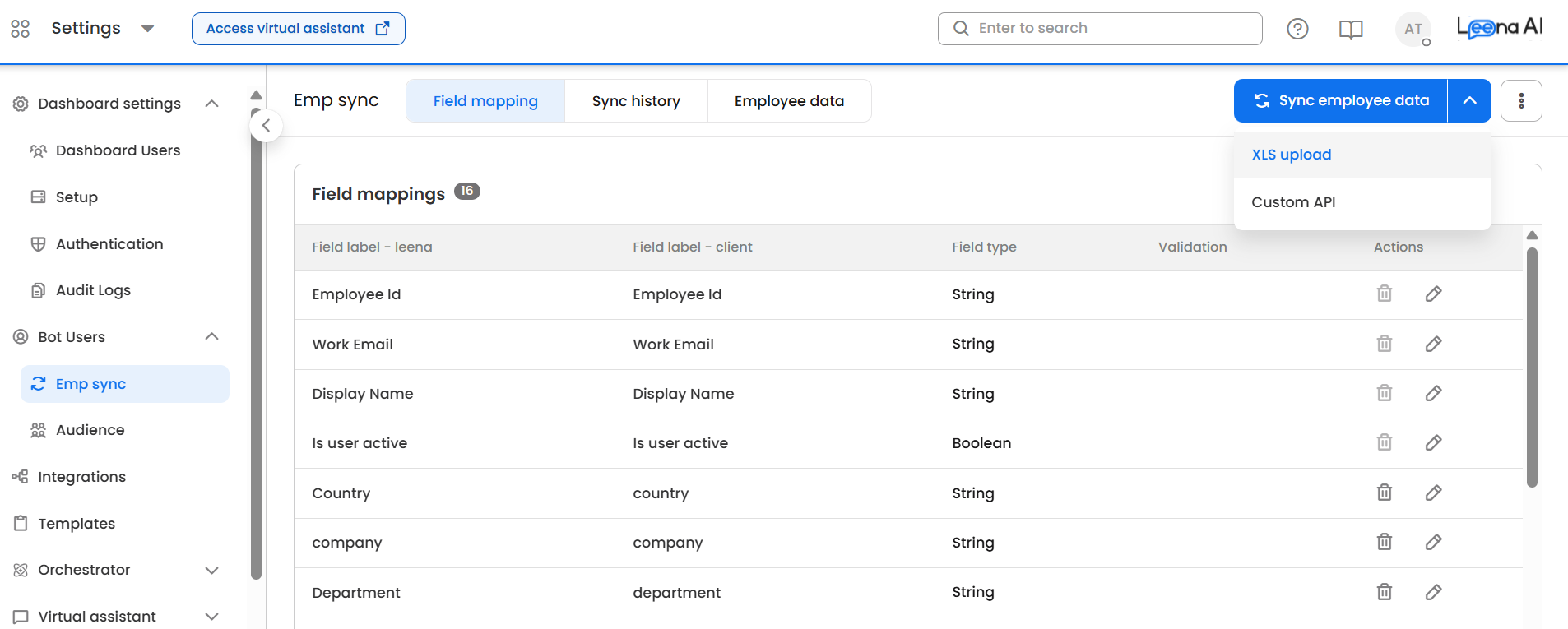 - Create Field Mapping: Define which spreadsheet columns map to which Leena AI fields and set validation rules.