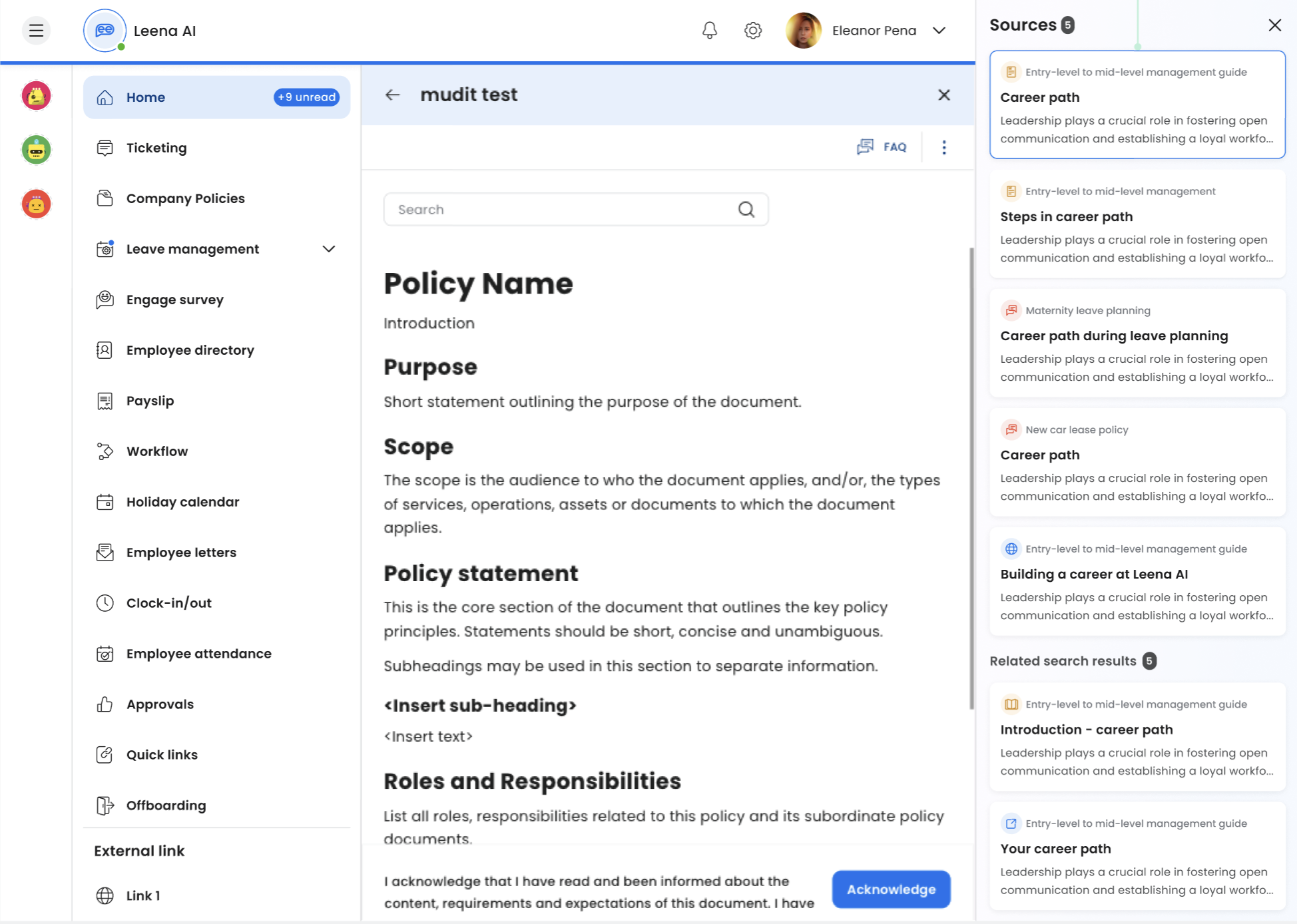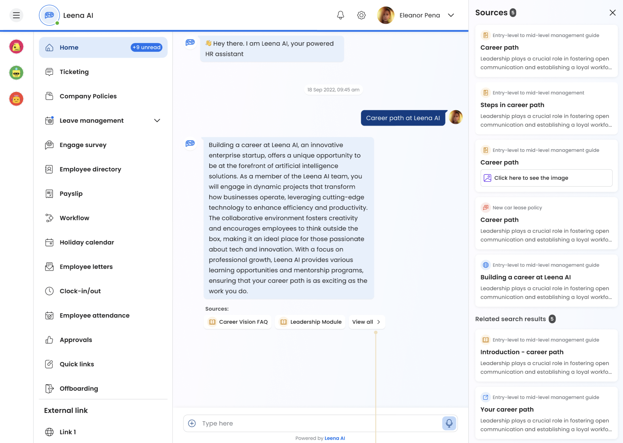 We are excited to introduce an enhancement in how sources of bot responses are displayed. This feature is designed to provide a clearer and more accessible way for users to view the sources contributing to a bot response and explore related search results seamlessly. This new interface shall be available on the web link of the virtual assistant and on the Leena AI app on both desktop and mobile devices.