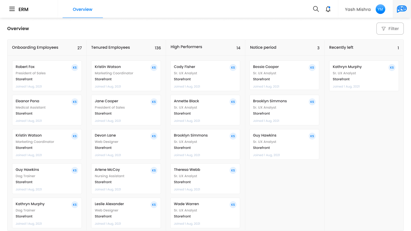 From the overview page and the filtered list, you can click on any employee card to navigate to the individual employee page.