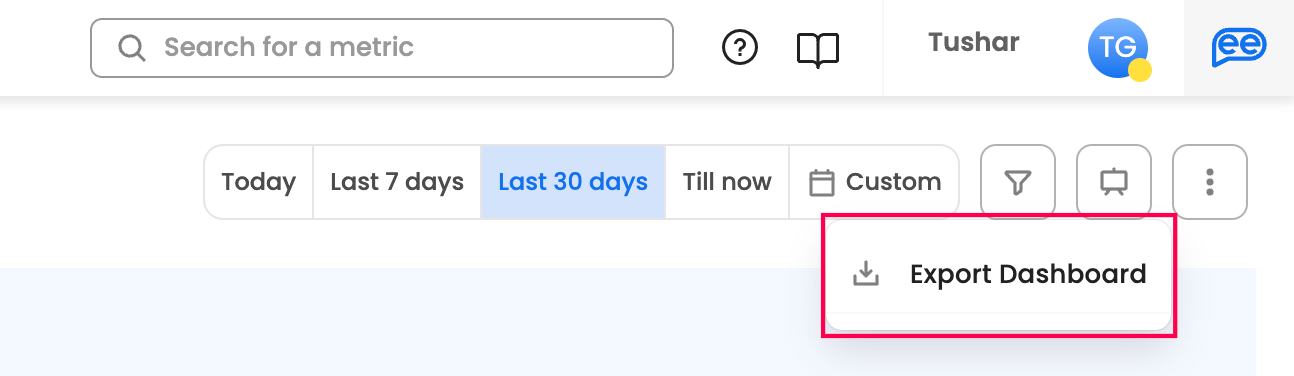A data dump in Excel format can be exported for the overall bot analytics dashboard by clicking on the 3 dots on the top of the page.