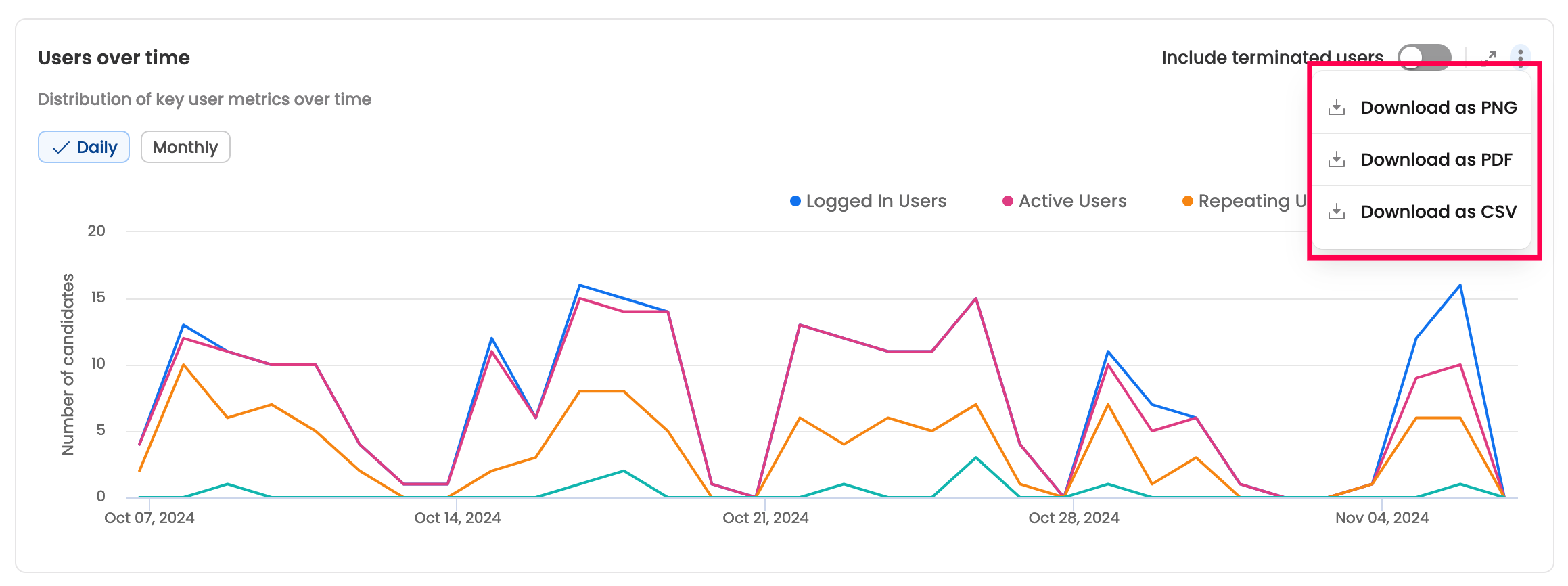 A data dump in Excel format can be exported from every panel. Additionally, some panels offer exports in PDF and PNG formats. Click on the three dots on the right side to download.