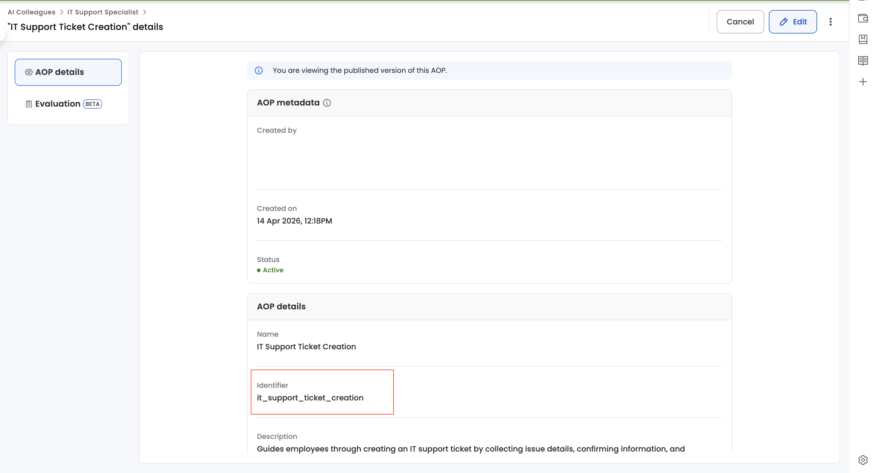 - In the AOP details section, locate the Identifier field. The value shown there is your