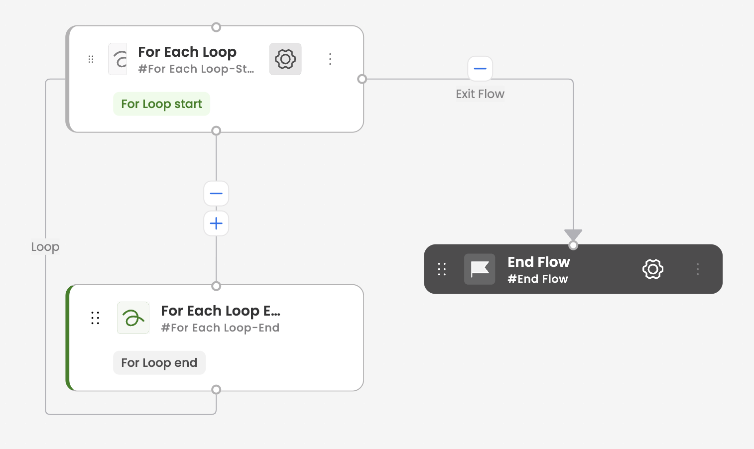 For-Each loop allows workflow designer to iterate through a defined array of objects or array of strings. With each iteration, the loop considers the equivalent index of the array.