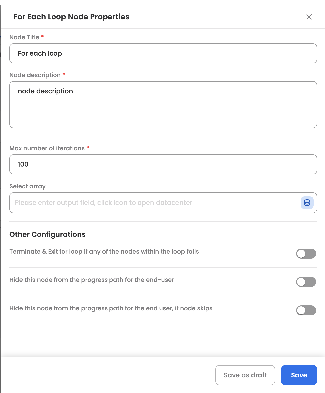 Hide this node under progress path for the end-user | Boolean | The entire loop node would be hidden under the progress path (web-views) for the end user. |