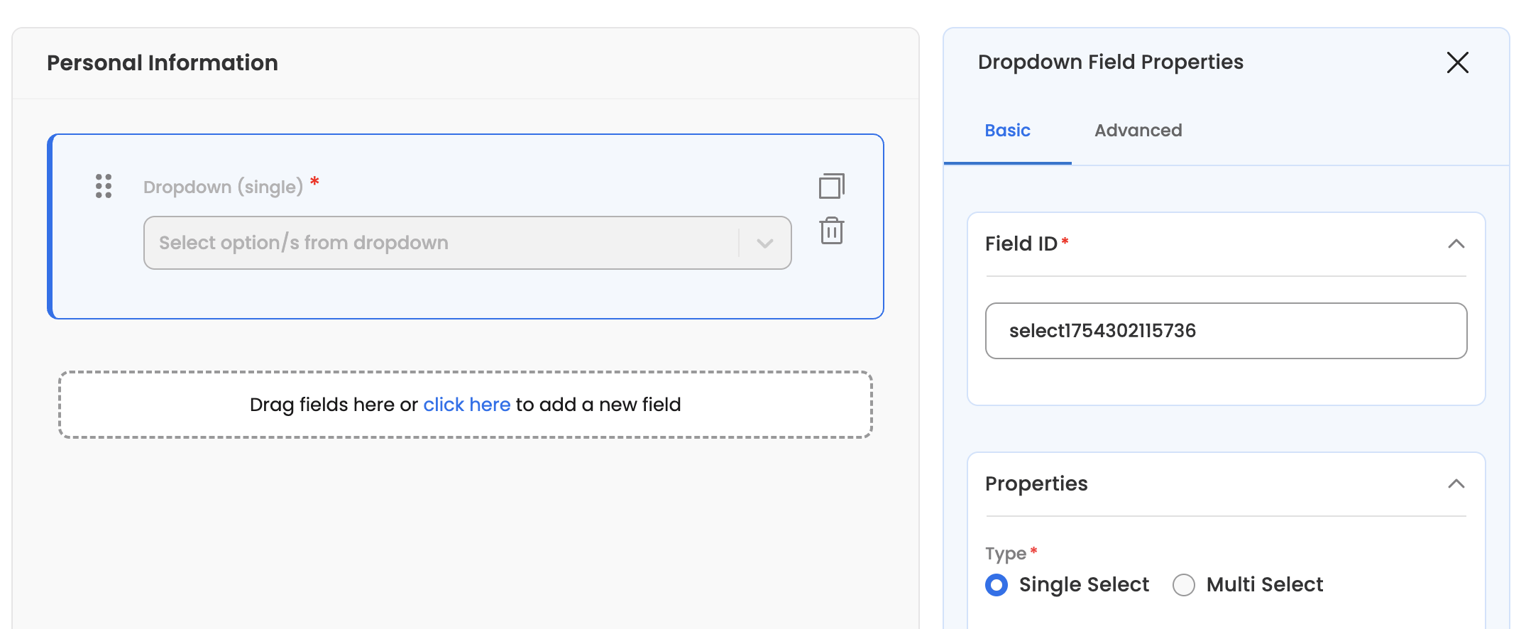 - Visibility (Advanced): Define the field’s visibility based on other fields or their values.