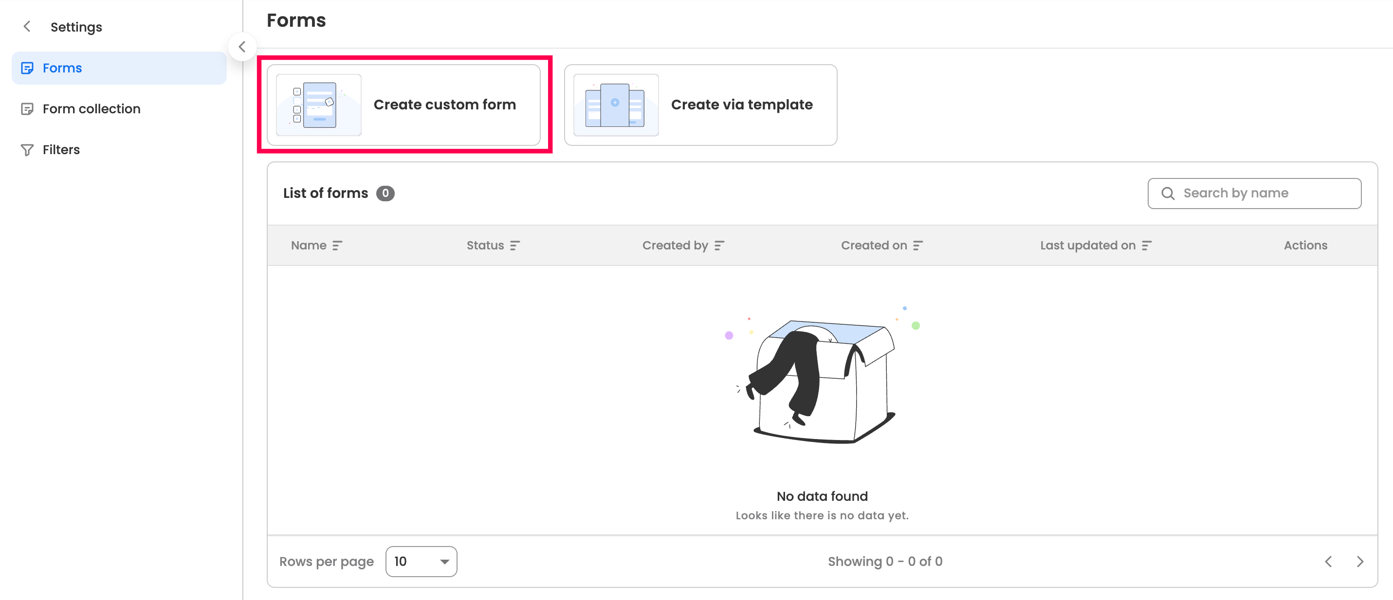 Click “Create Custom Form” to build a new form, or use an existing template to create one quickly.