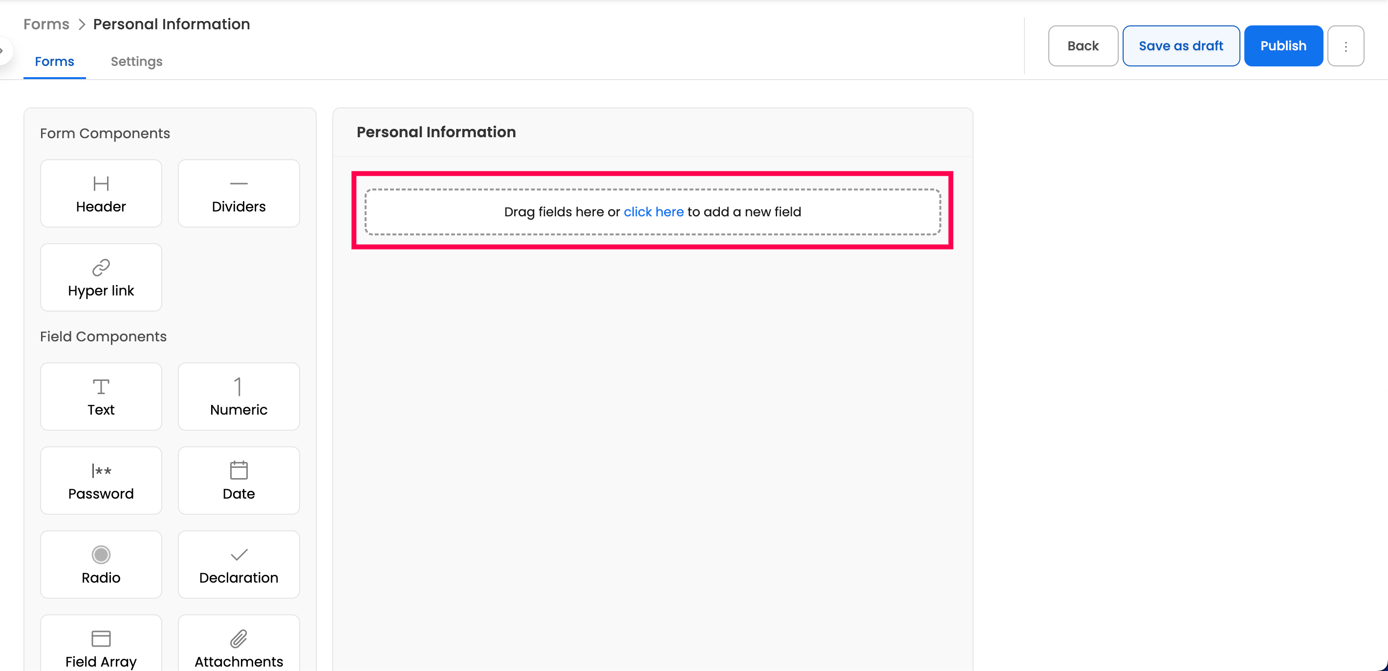 Field components: Add fields you want to include in the form—these can be auto-filled or manually completed by the user.