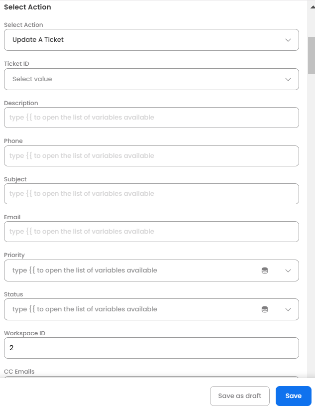This action is used to update a ticket record with a given ticket id in FreshService. Post a ticket ID is provided, all the fields render which can be updated with the new values.