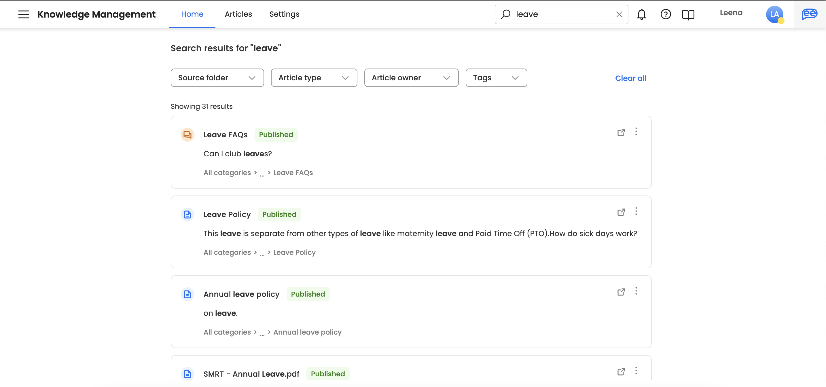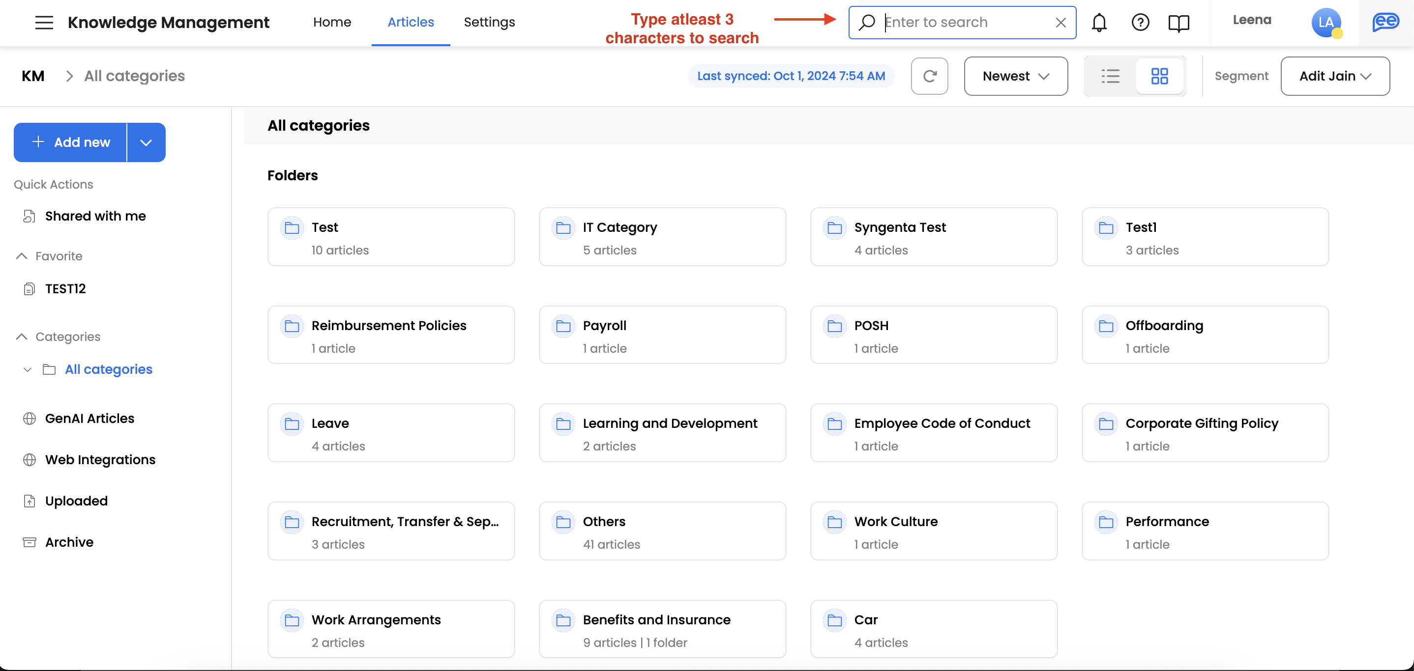 This document outlines the enhancements made to the search functionality on the KM dashboard. Previously, searches were limited to articles and FAQ titles. The updated search now includes article content, audience names, and relevant keywords, providing a more comprehensive and efficient search experience.