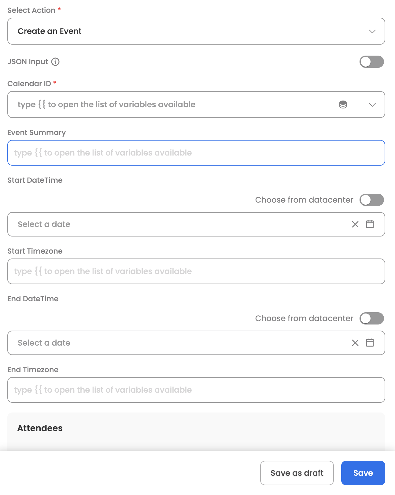 Attendees | List of attendees for the event; each attendee is an object of email |