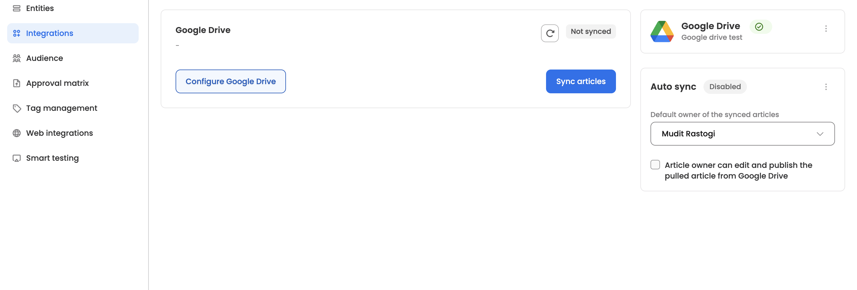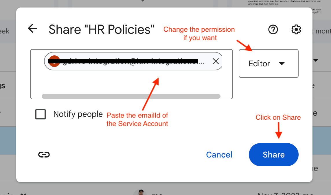 Note: If you want to fetch article permissions as well from Google Drive, you will have to share Editor access for the files with the service account.