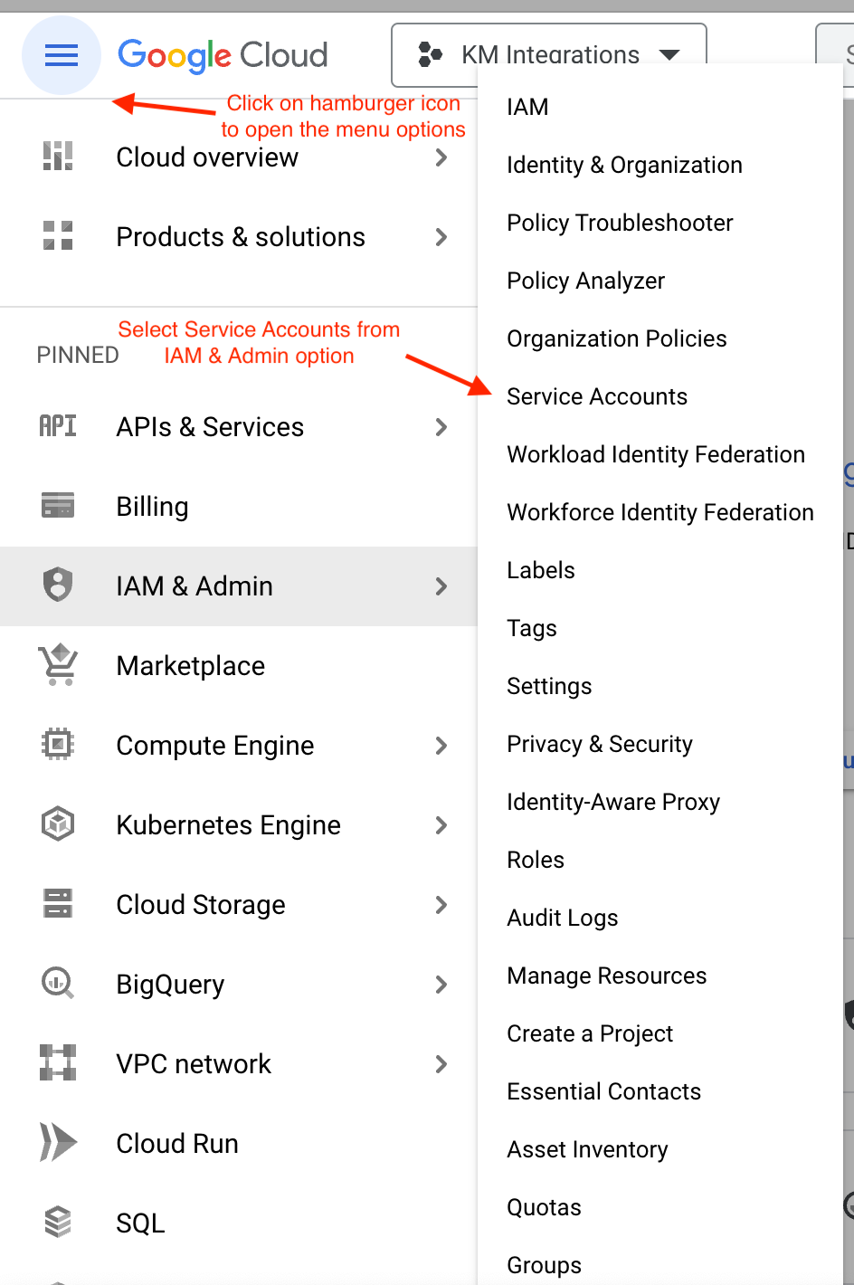 Once you have selected your project, go to the Service Account section inside the IAM & Admin option.