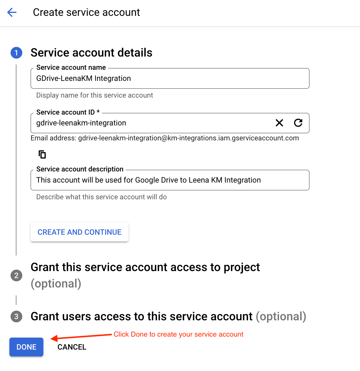 If creating a new Service Account: Fill in the required details in the form and click on Done.