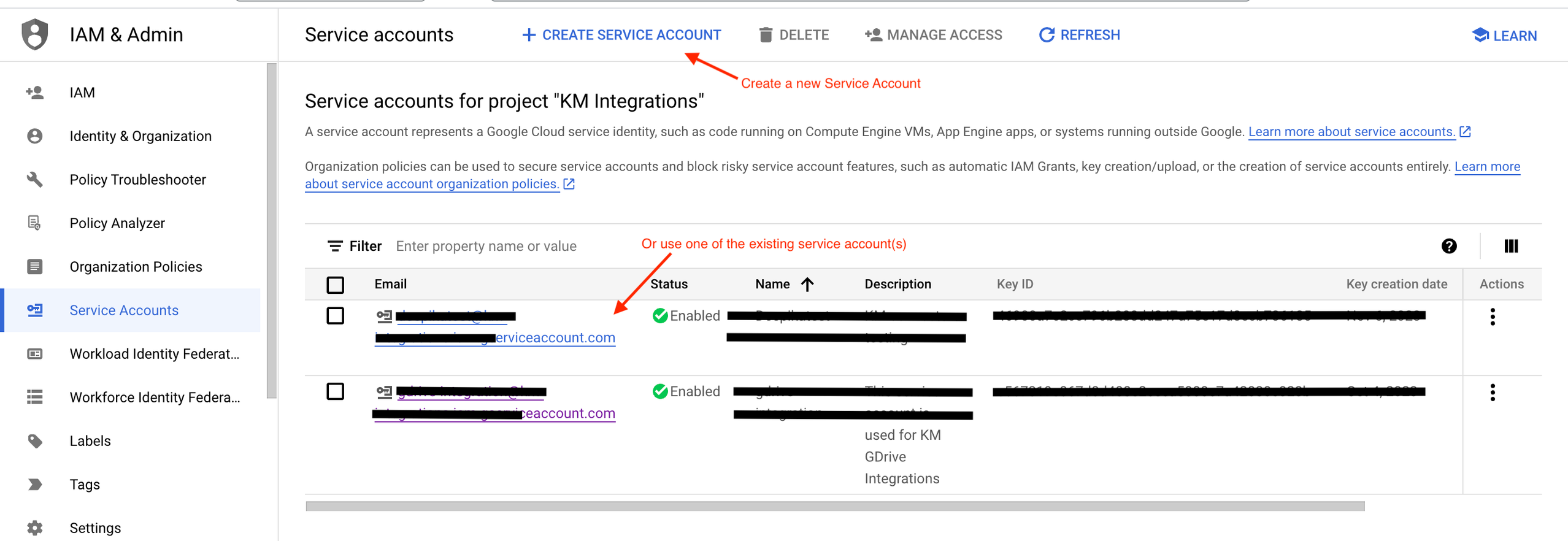 We use a Google Service Account to establish the connection. Users use the service account key to set up the integration and share the files present in Google Drive with the Service Account email ID. This grants the Service Account access to files, allowing them to be synced with KM.