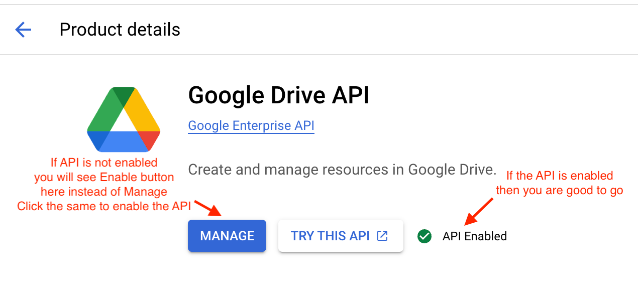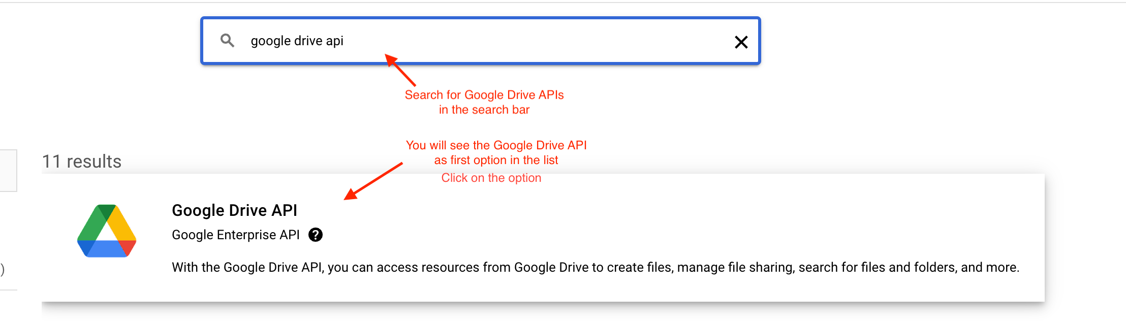 Enable Google Drive APIs Now your service account is ready. You must ensure that Google Drive APIs are enabled in your Google Cloud Project.