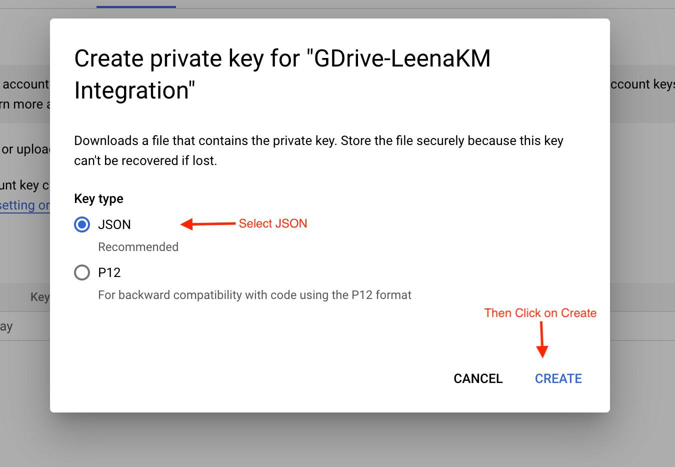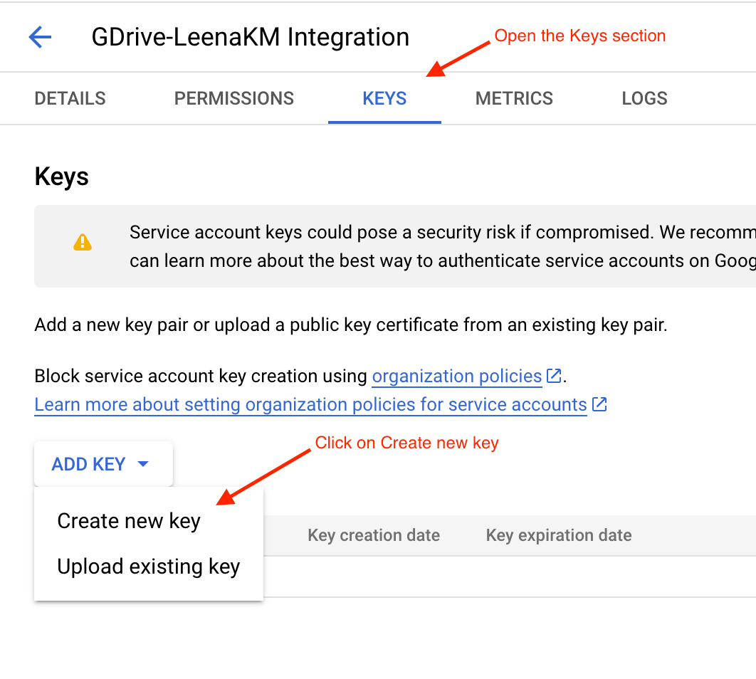 Click on Create new key to generate a new Key for the service account that will be used in the Leena KM-Google Drive Integration.