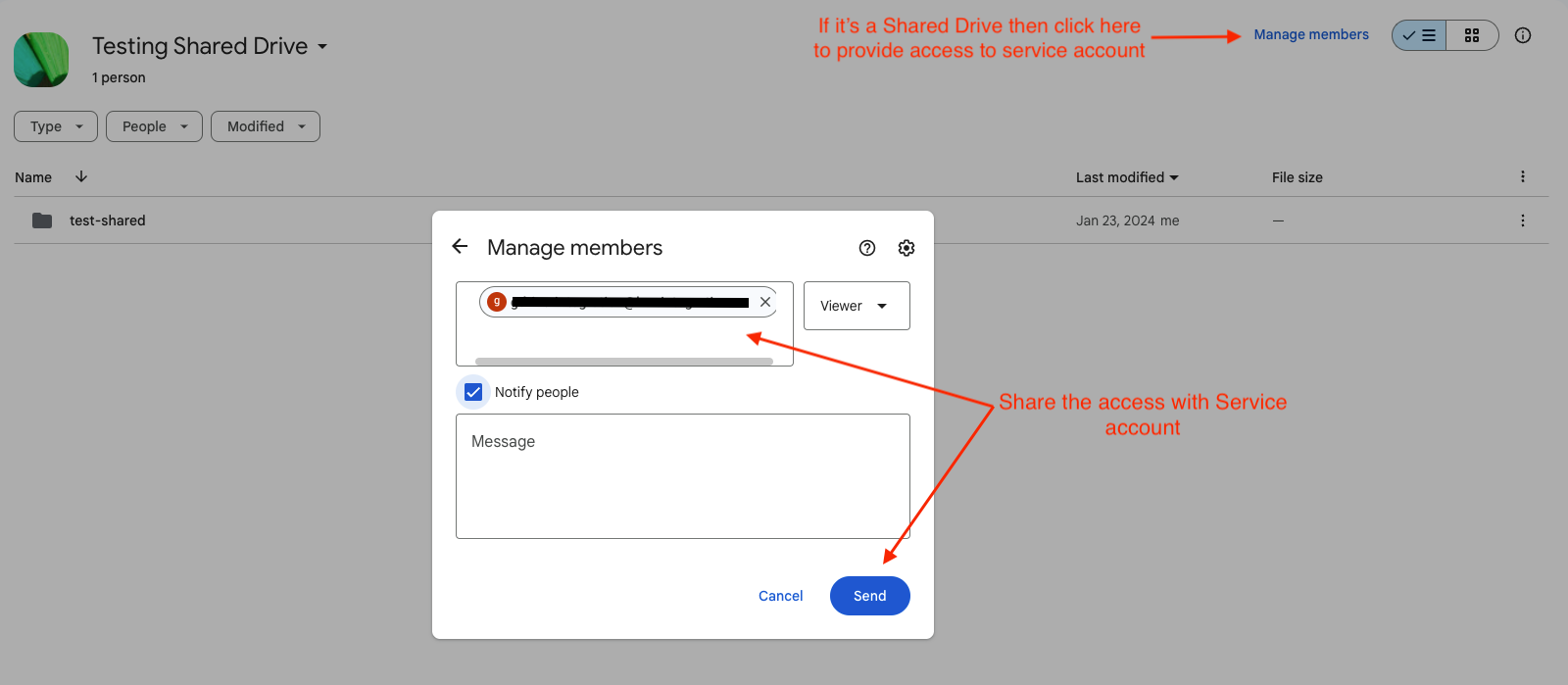 - The service account will now have access to all the folders and files within the Shared Drive.