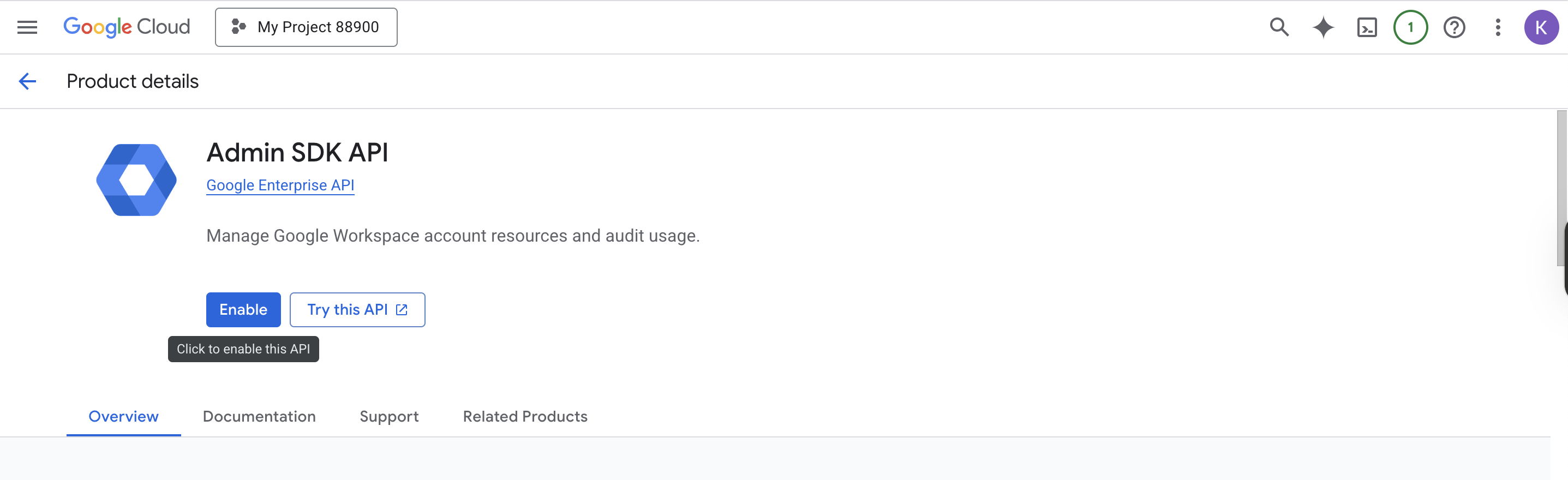 Enable the Admin SDK API: In the API Library (APIs & Services > Library), search for Admin SDK API and click ENABLE.