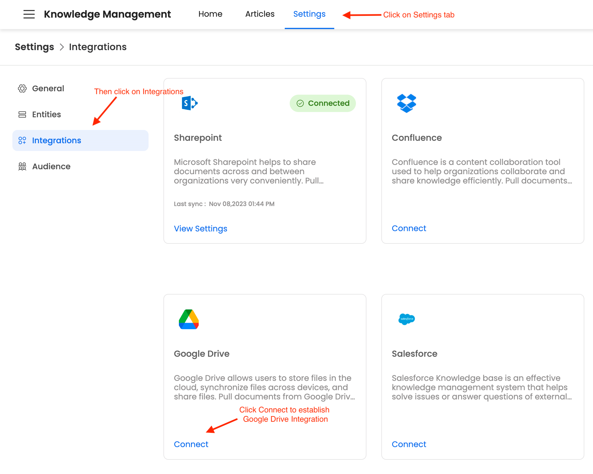 Follow the steps below to connect Google Drive with Leena AI’s KM.