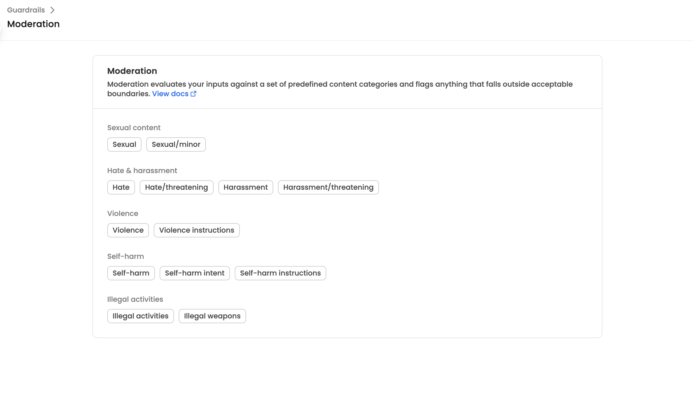Click the Moderation card to view the currently active content categories. Moderation cannot be individually enabled or disabled — it is managed as part of the org-wide guardrails toggle.