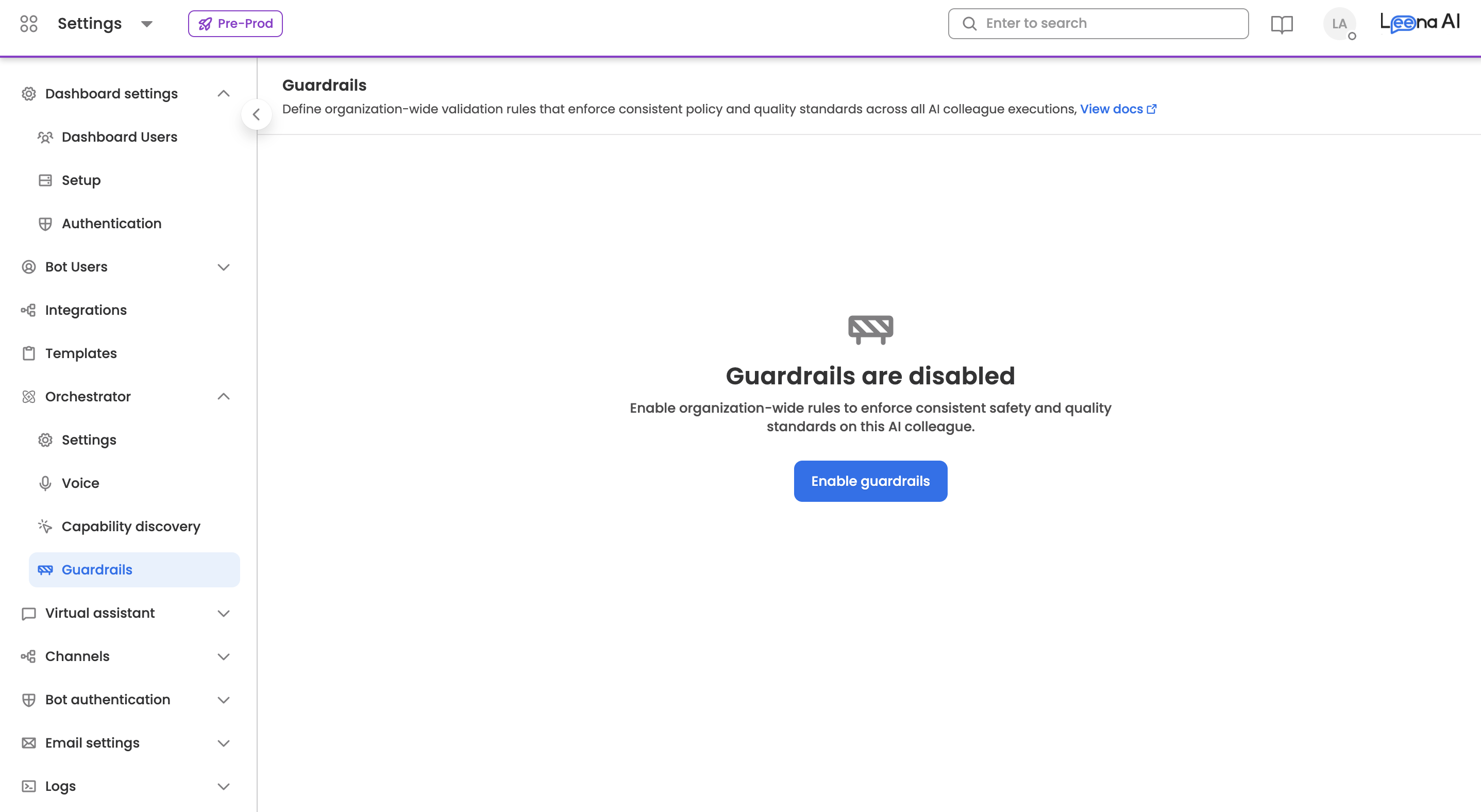 Navigate to Settings → Orchestrator → Guardrails to access this page.