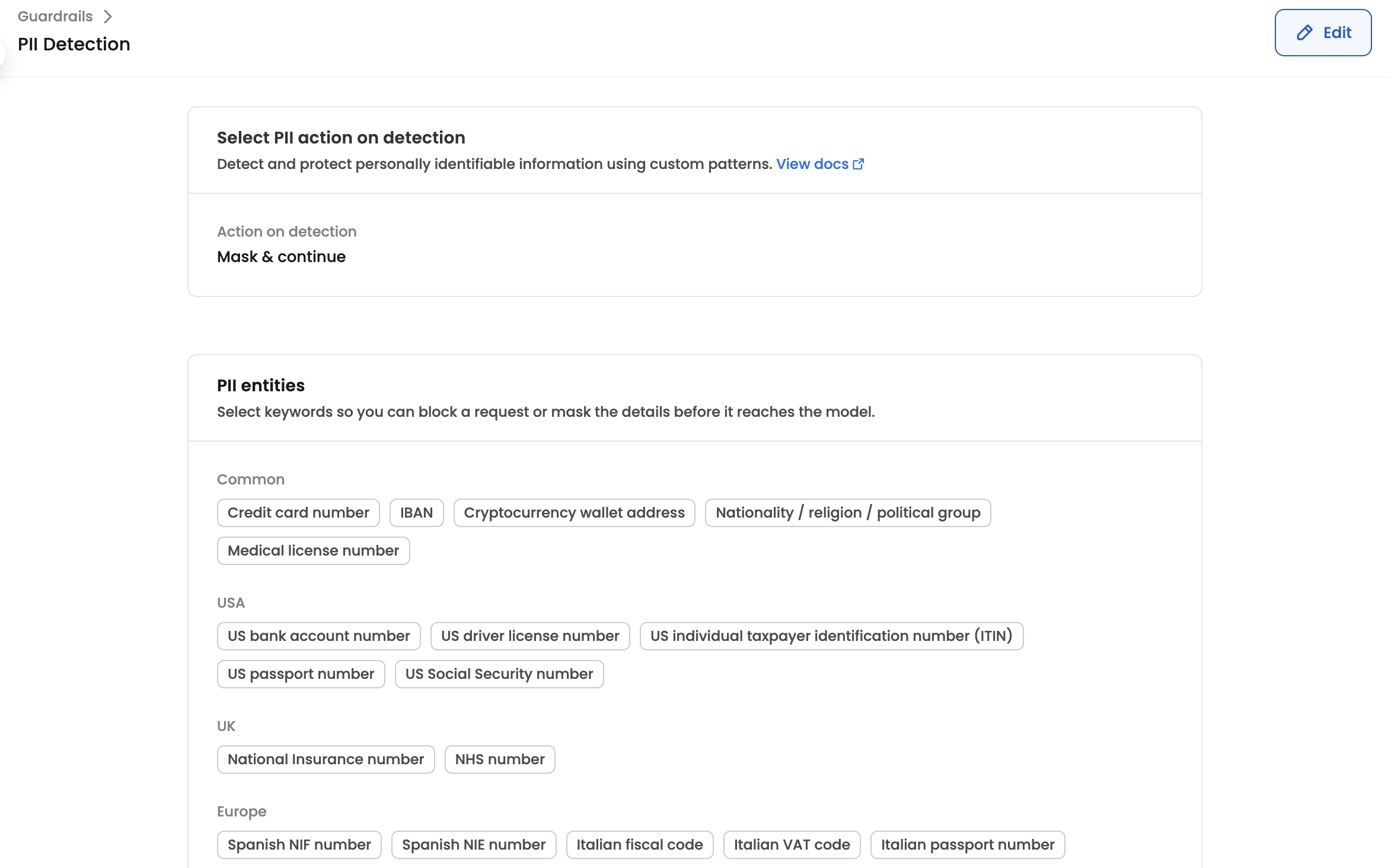 Click the PII Detection card to open the detail view, which shows the current action and selected entities as chips. To make changes, click Edit in the top right.