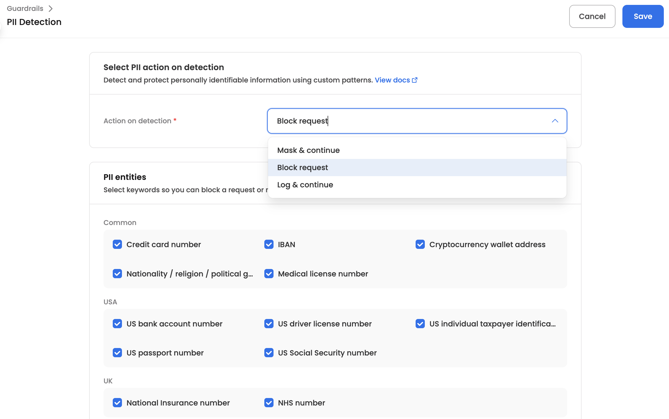 | Mask & continue (default) | Detected PII is replaced with a redaction placeholder (e.g., [EMAIL REDACTED]) and the conversation continues. |