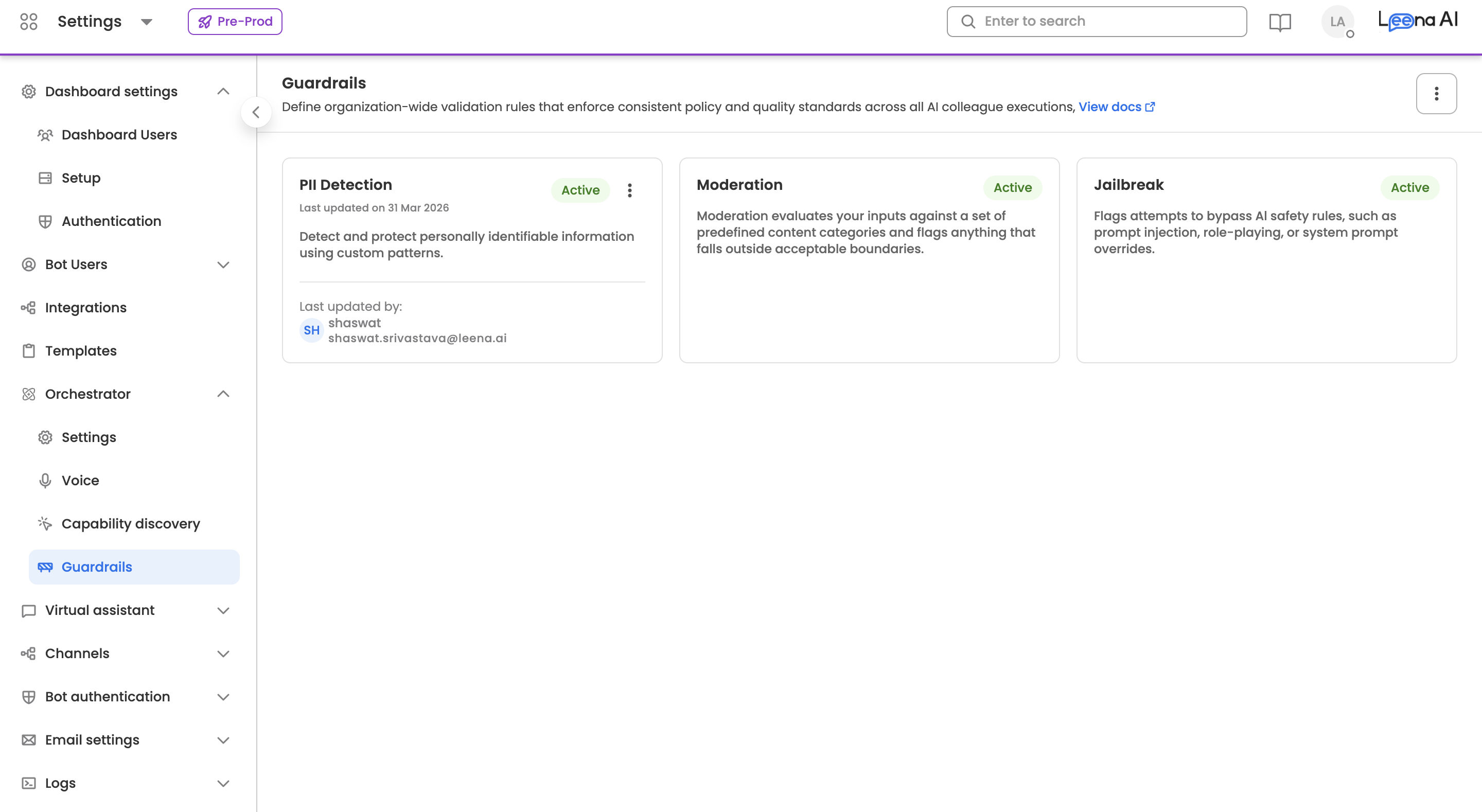 Once enabled, you will see three guardrail cards — each showing the guardrail name, its current status (Active / Inactive), a description, and who last updated it(for PII Detection).