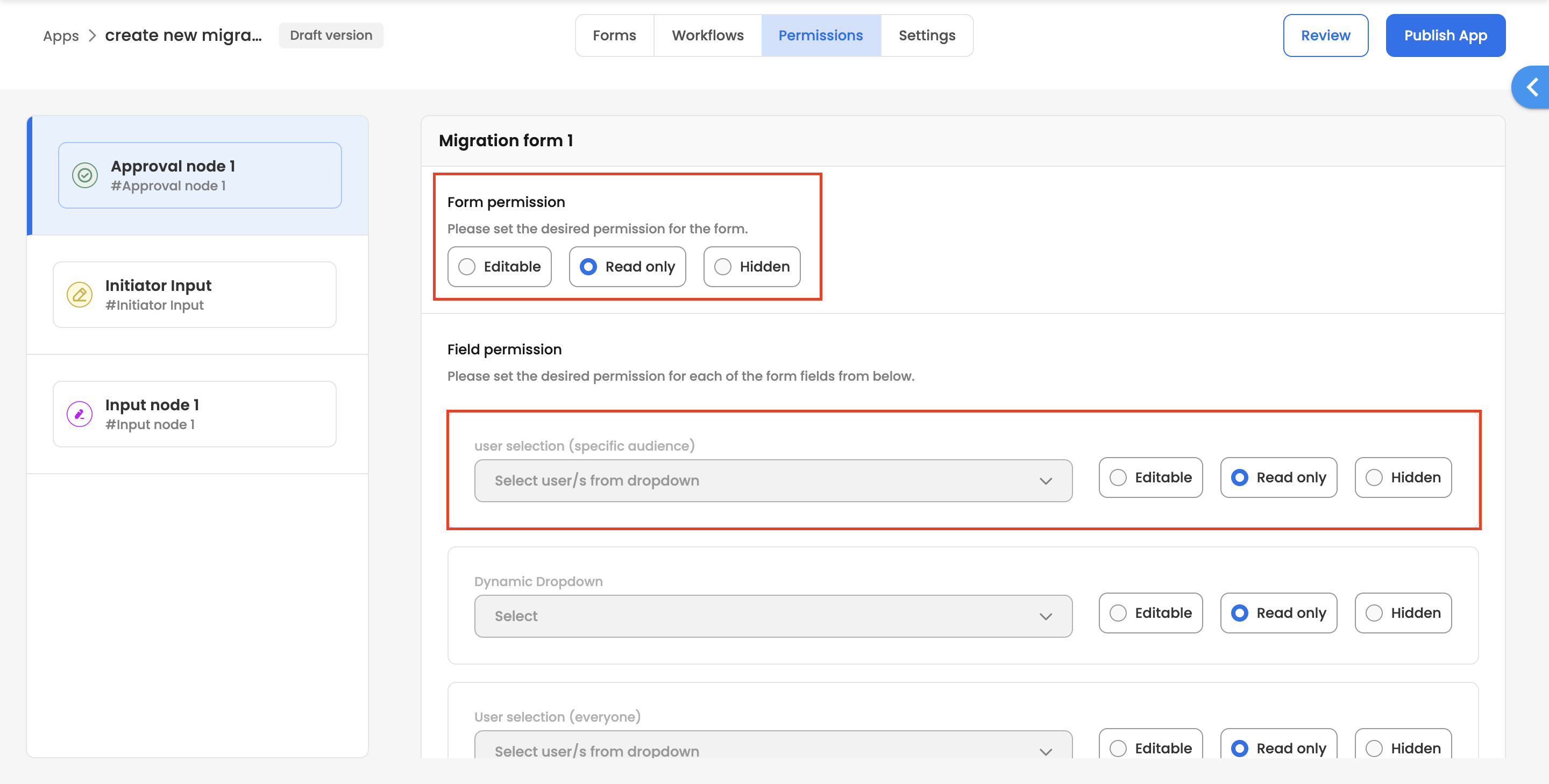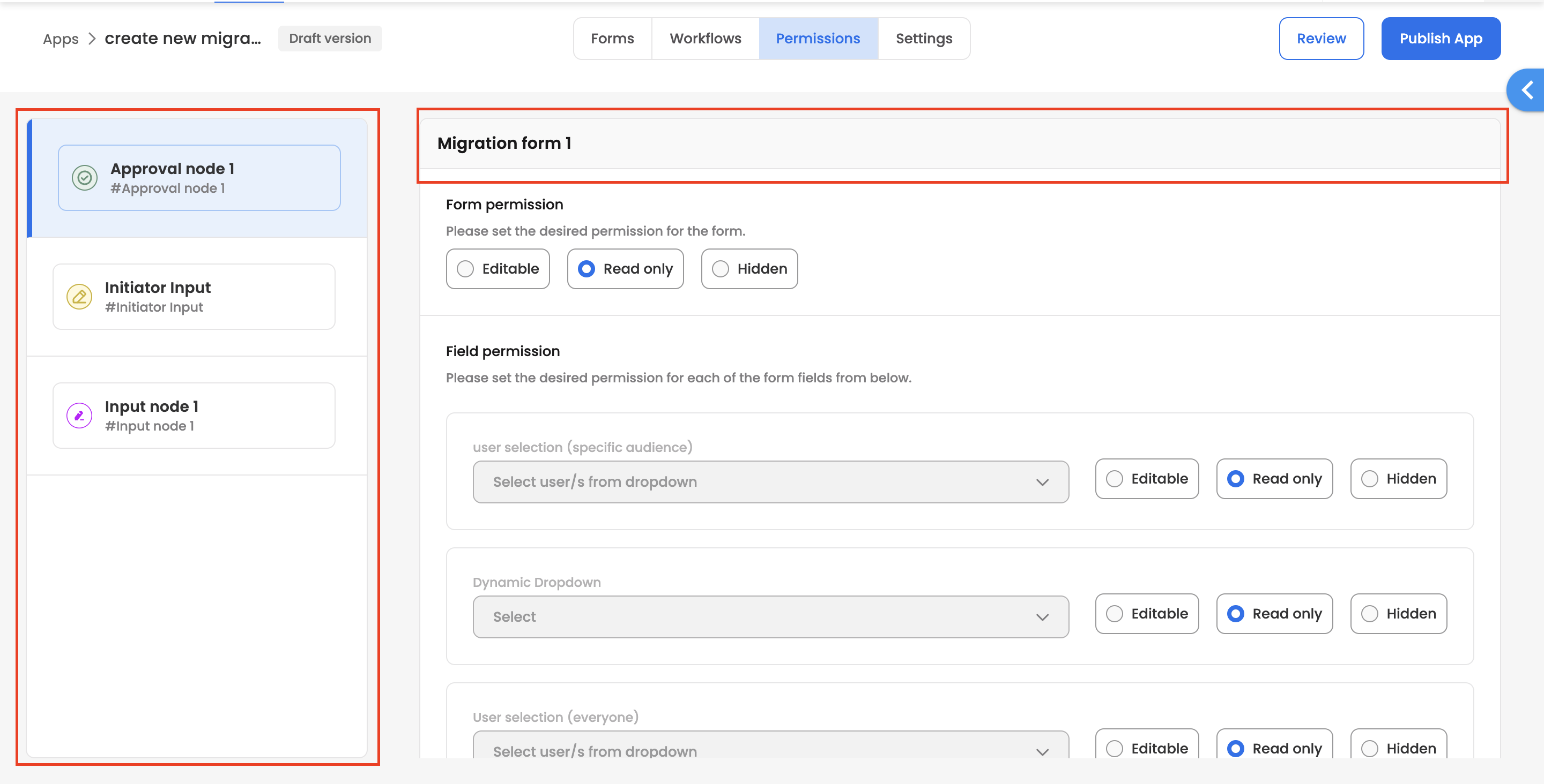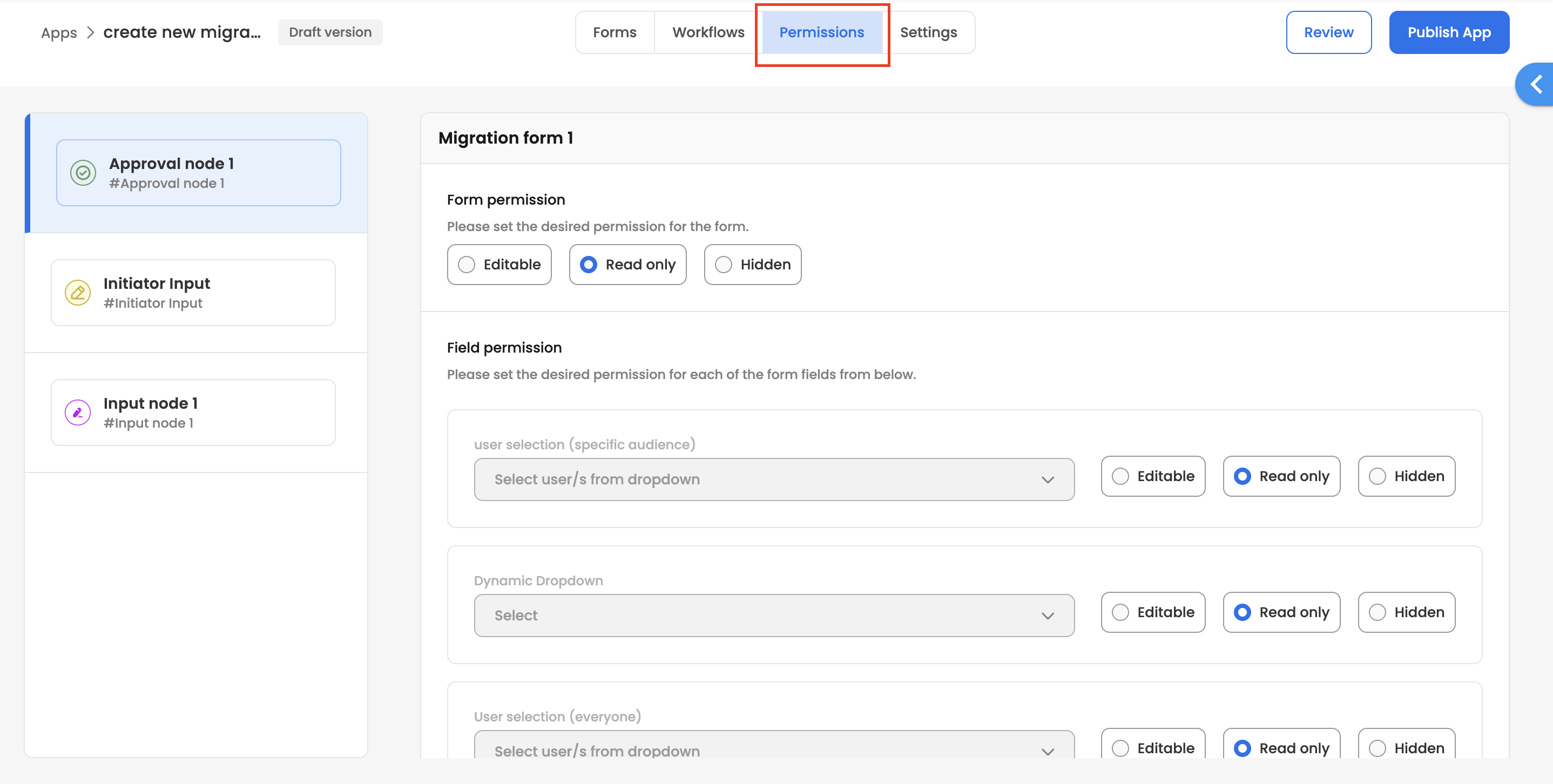 Within the Permissions section, on the left side, you can view all the approval & input nodes. Selecting a node allows you to configure permissions on forms' fields, for the forms added under that specific node.