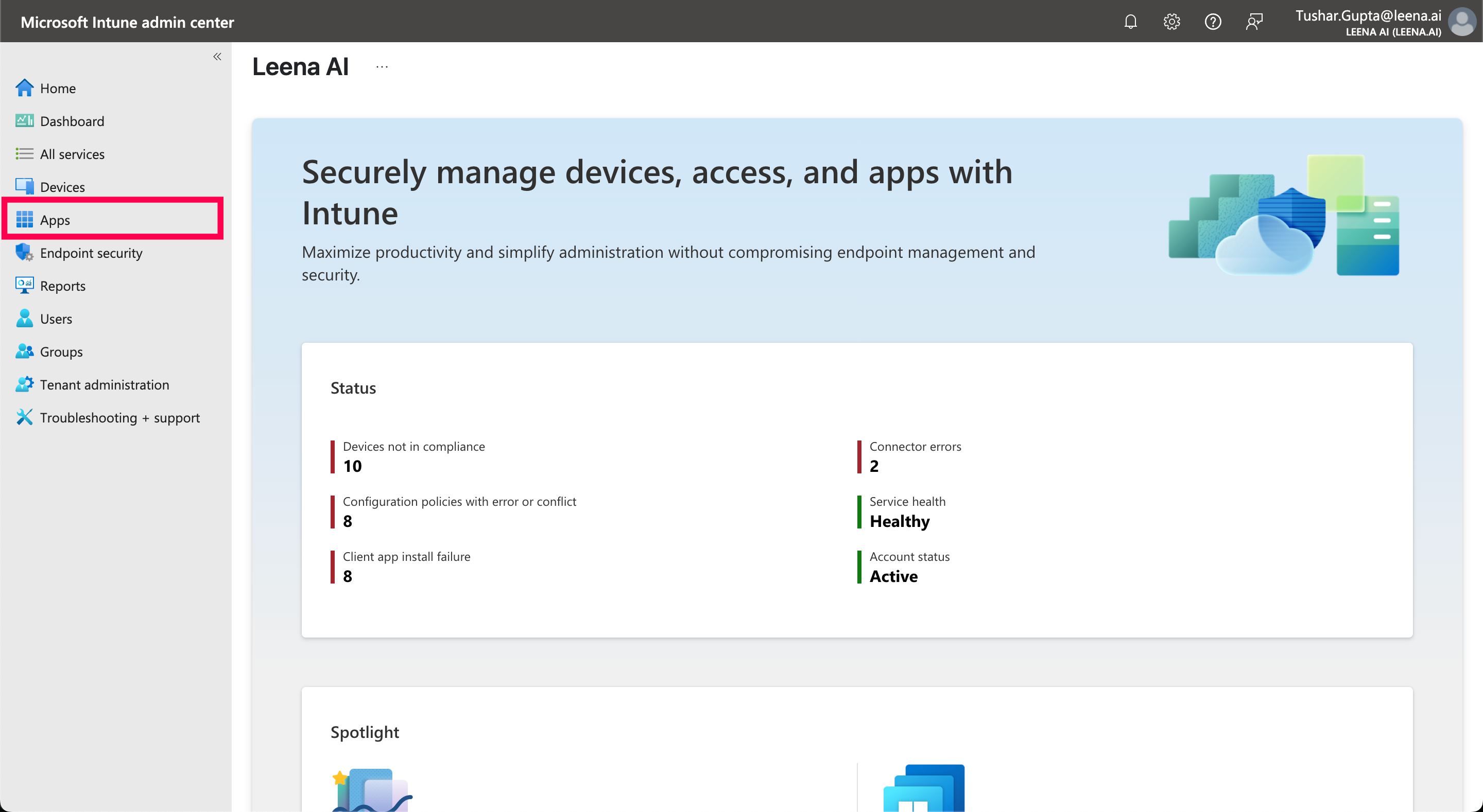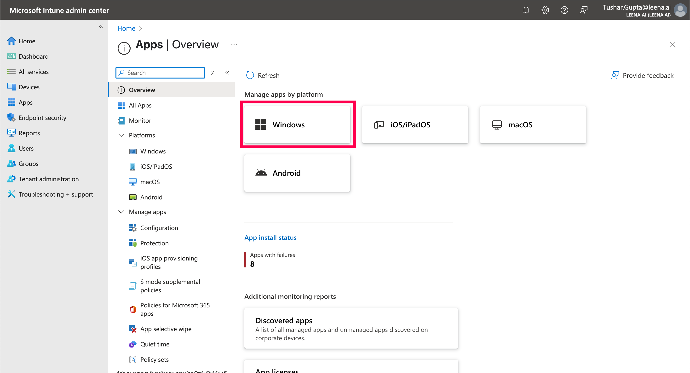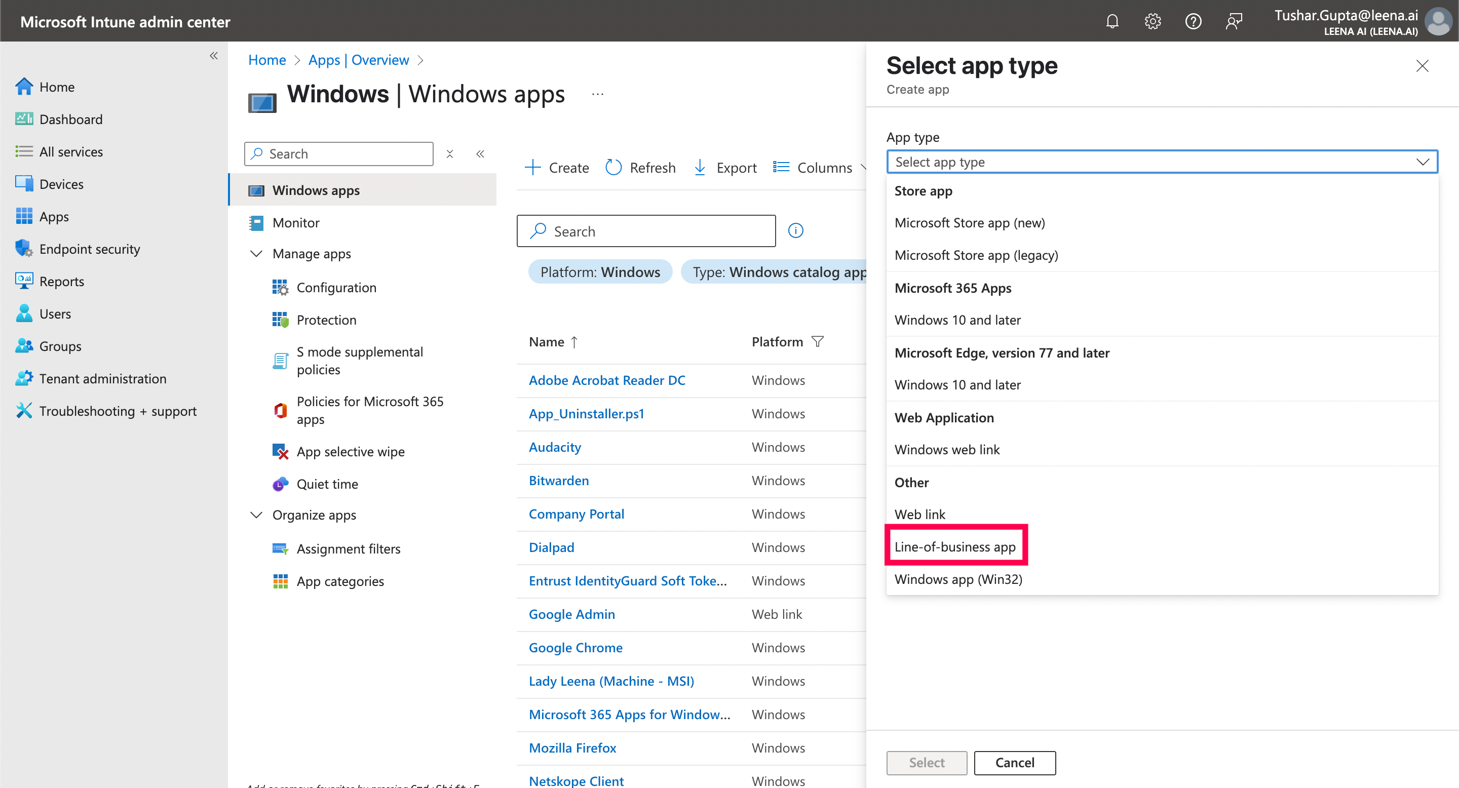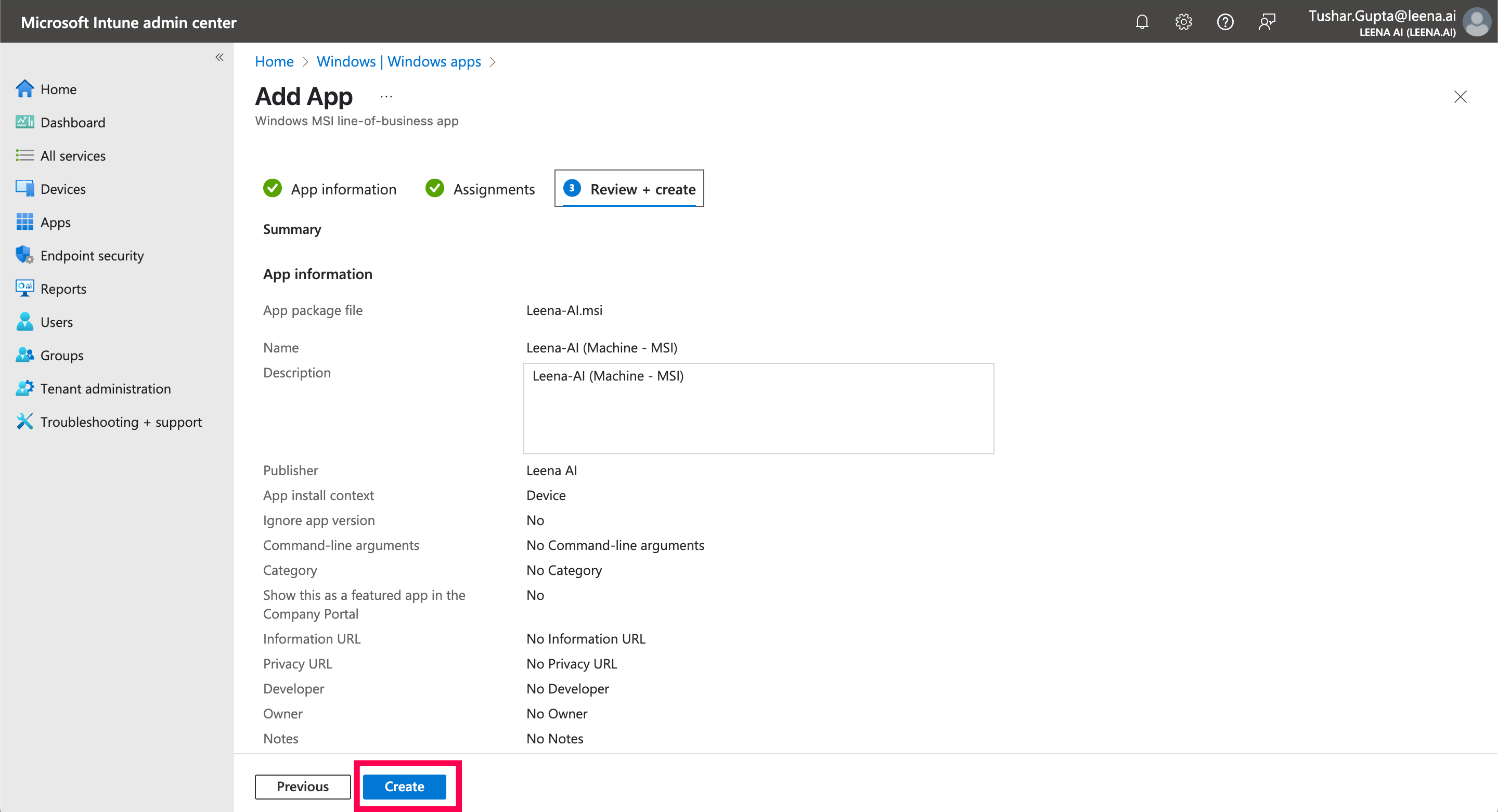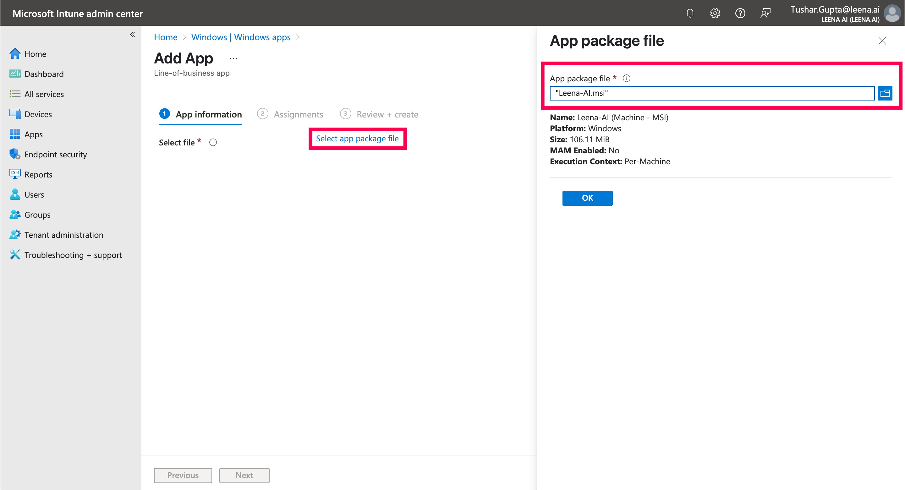 Once you receive the Leena.ai Desktop App for Windows (.msi) from our implementation team, follow these steps to deploy it using Intune:
