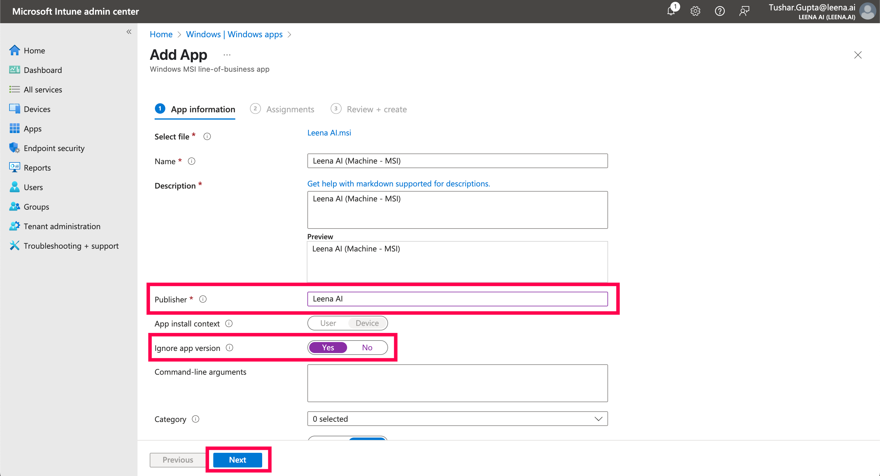 After clicking OK, the form will be pre-filled. Simply update the Publisher field to “Leena AI,” set Ignore app version to Yes (since the Leena app supports auto-updates), and then click Next.