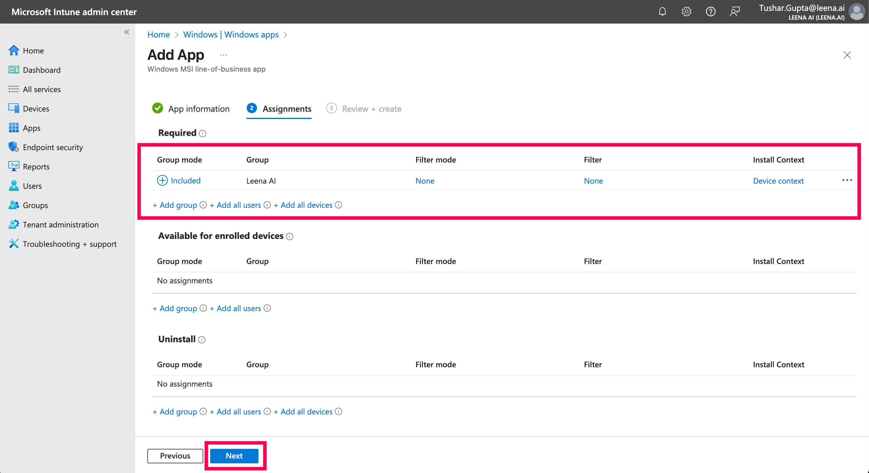 Now, add the relevant groups, devices, or users you want the app to be deployed to, and then click Next.