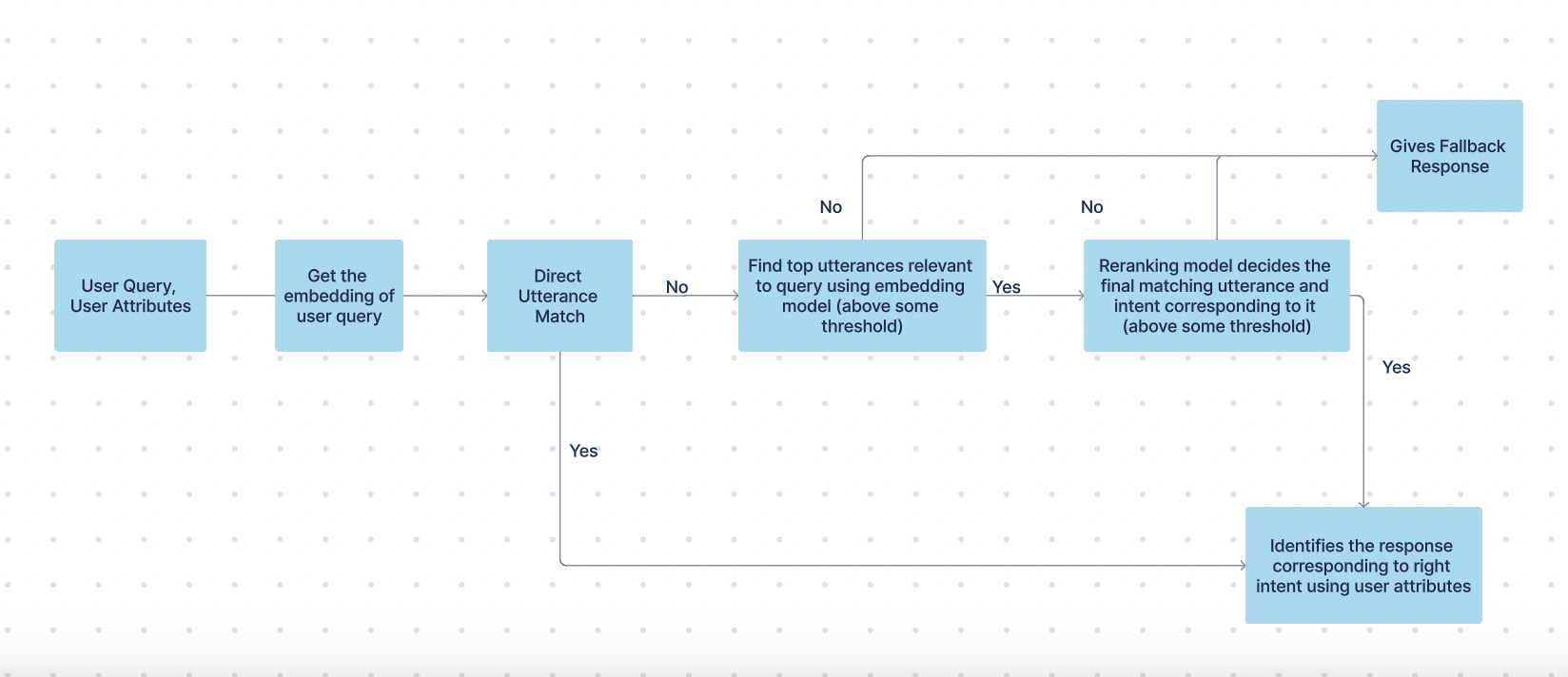 - Intent Prediction Pipeline (Less Used): This pipeline directly retrieves a response from a pre-defined "question book" type of article. Using a classical ML approach, it matches the query against these questions and, if the confidence score exceeds 0.95, returns the corresponding response immediately.
