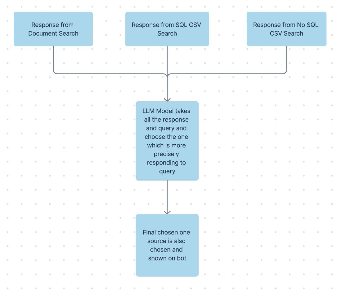 - Multiple Pipeline Responses: If responses are received from more than one pipeline (e.g., both Document Search and CSV Search), the final LLM evaluates them to choose the response that best addresses the query—ensuring it is clear, precise, and unambiguous. The source associated with the chosen response is then retained.