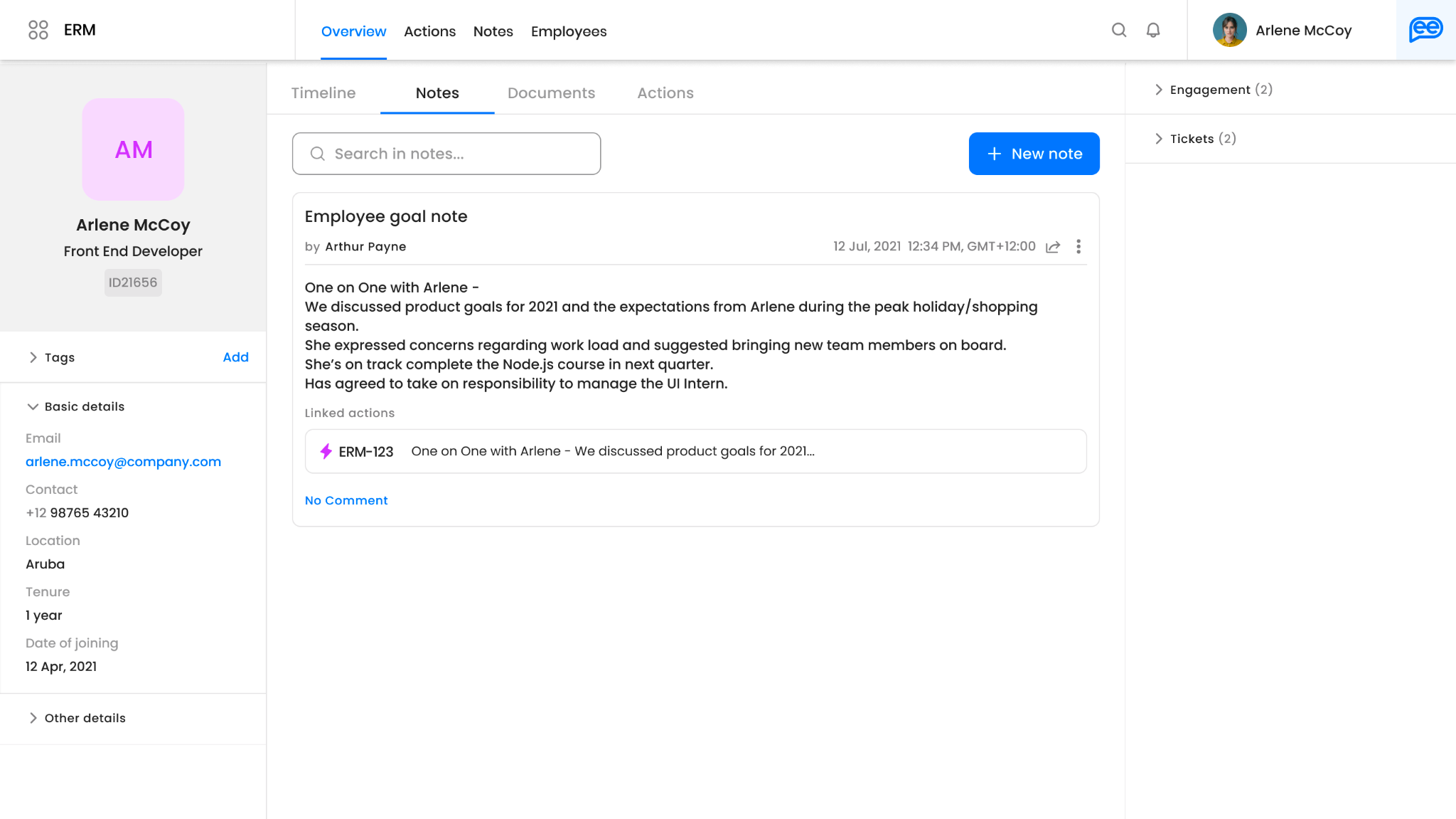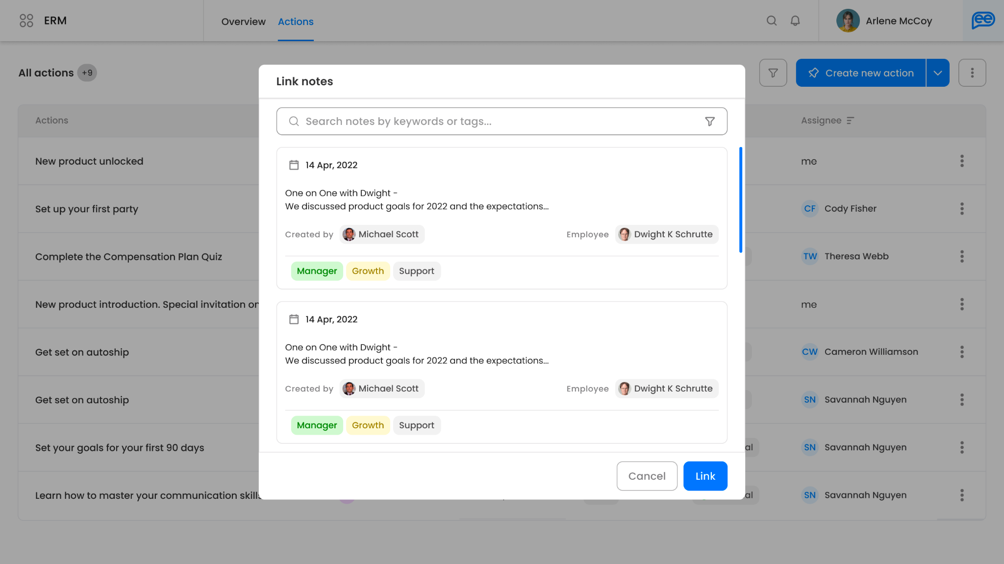 Users can link an action to a note and vice-versa. If an HR manager creates an action to have a one-on-one with an employee and assigns it to one of their team members, the team member can put the recording or the key points from that interaction in a note. This note can then be linked to the original action created by the HR manager. It will help provide the HR manager with visibility to easily track the progress on the action. It will also ensure that the conversation is stored there for any future reference.