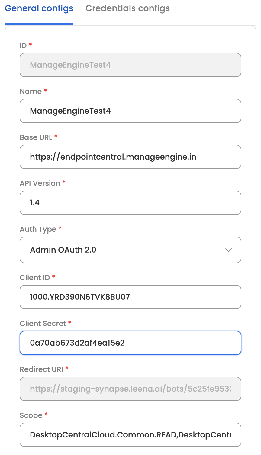 The ManageEngine Endpoint Central connector enables your Leena AI Agents to integrate with your organization's ManageEngine Endpoint Central platform, facilitating automated endpoint management, inventory tracking, patch management, and vulnerability assessment workflows.