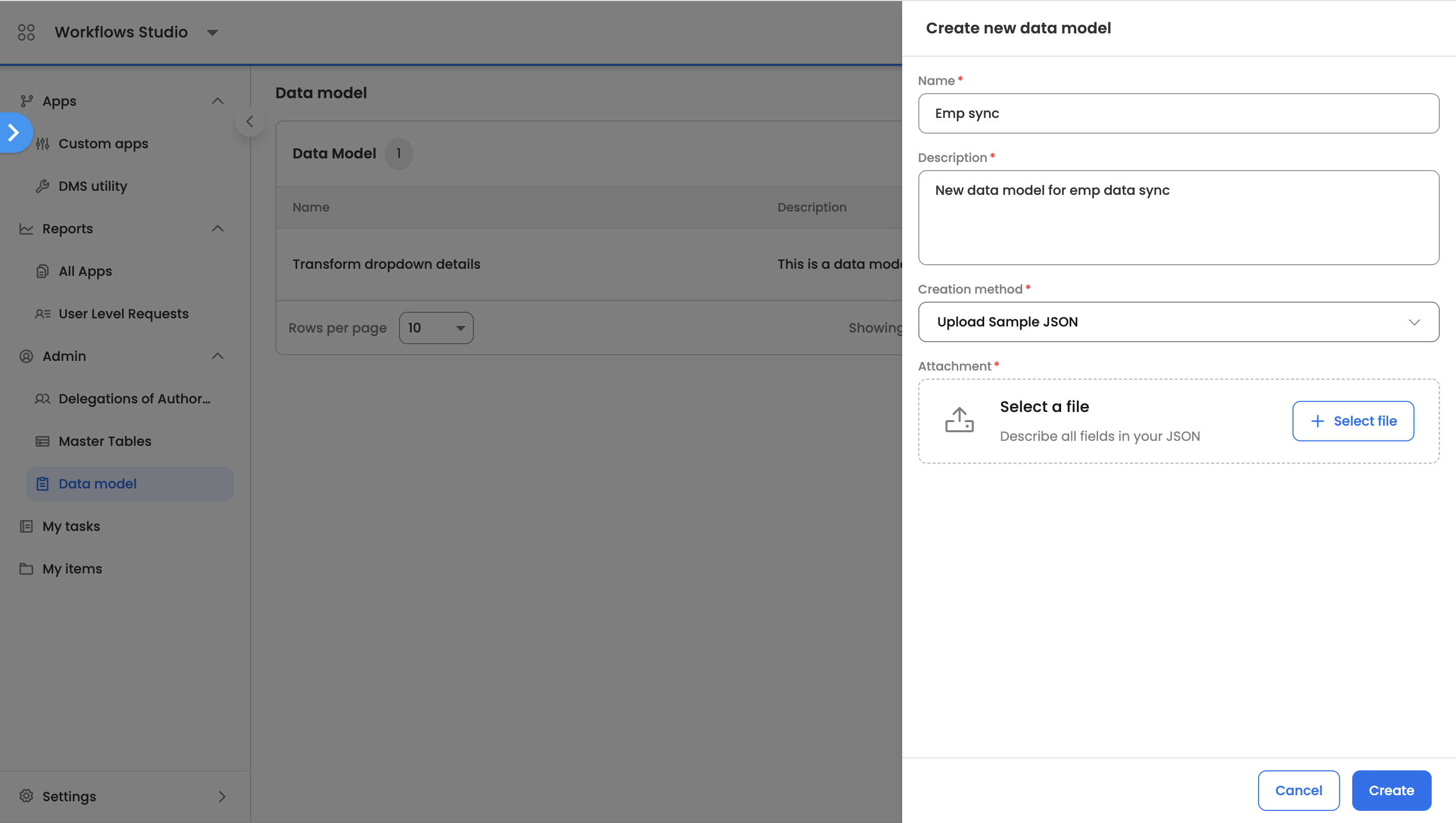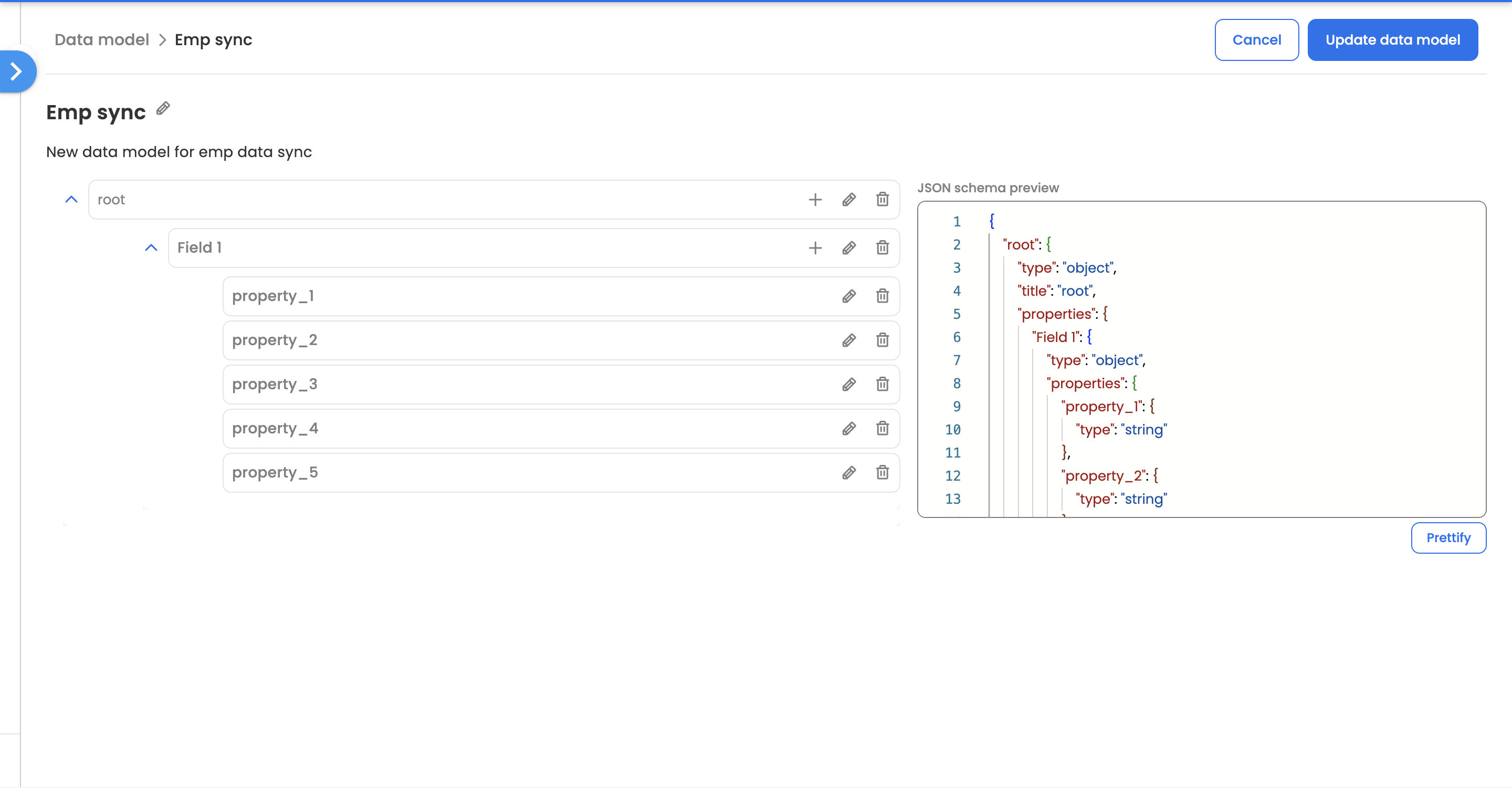 - Add via JSON: Upload a JSON schema to define your Data Model. You can also download an existing schema, modify it, and re-upload.