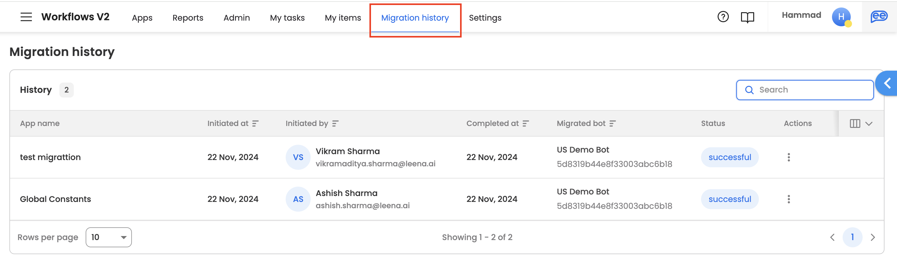 Workflow admins can view the critical information points related to a migration such as, which user migrated the app, when was the app migrated, to which bot the app was migrated & was the complete process successful or not.