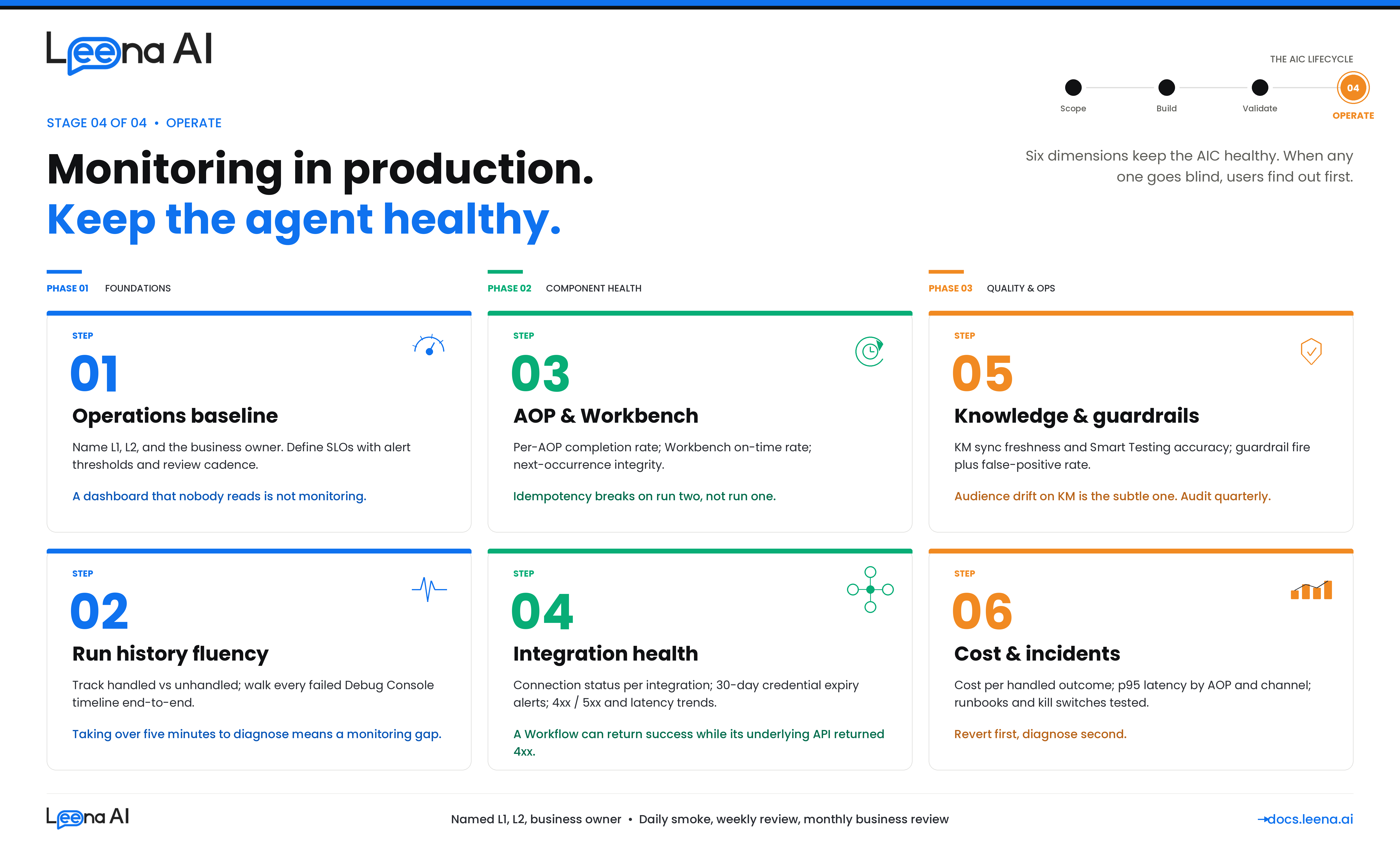 UAT tells you the AIC is ready for production. This guide tells you how to keep it healthy in production. It walks you through the seven things you need to put in place from day one of go-live — so that when something degrades, you catch it before an end user does, and when something breaks, you can diagnose it in minutes rather than hours.