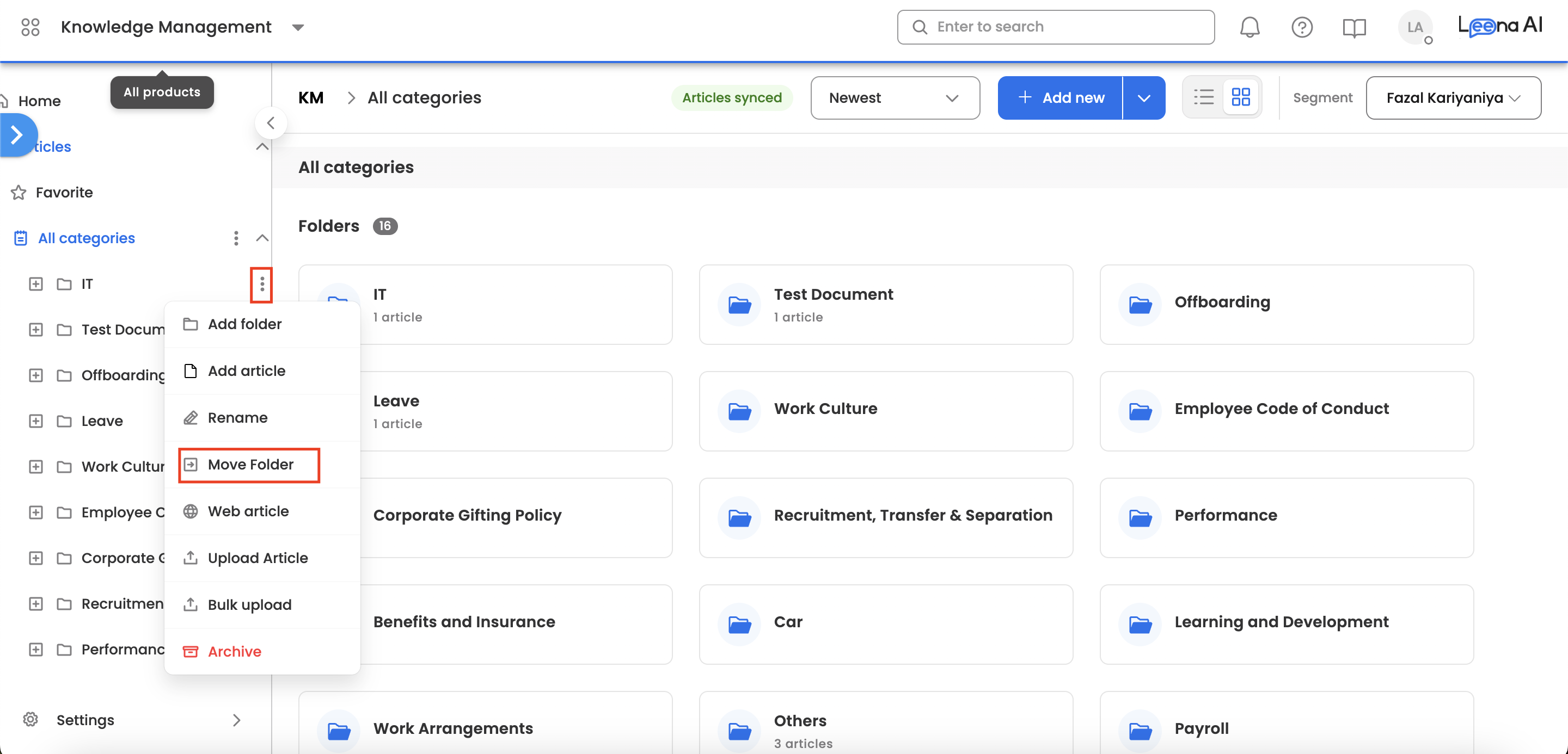 Users can now move folders from one location to another within the KM dashboard. Only folders inside the "All Categories" section can be moved. This action is restricted to KM admins and older owners only.