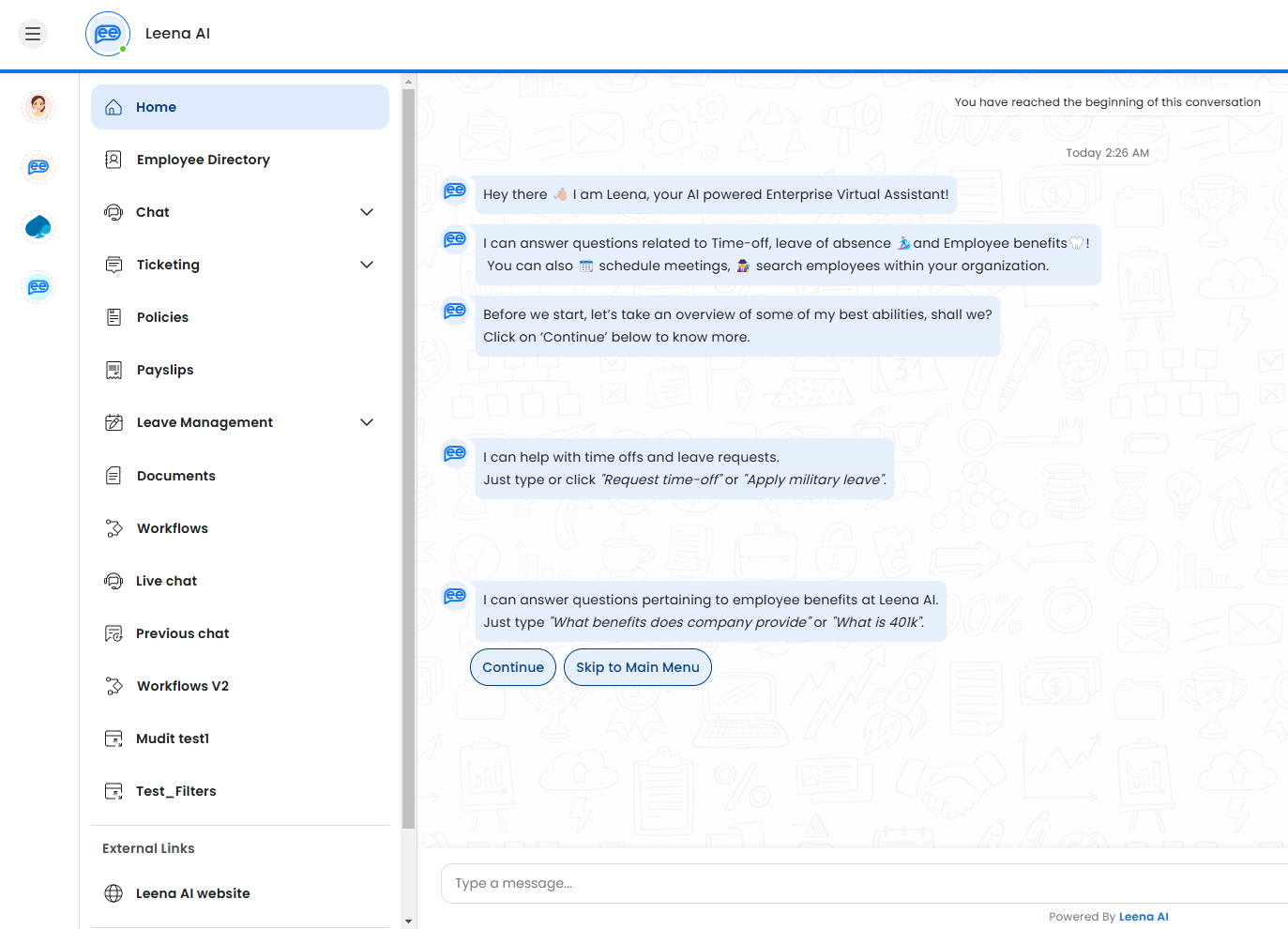 Bot Switcher - An enterprise can also choose to keep multiple virtual assistants for their employees based on different capabilties (example: IT vs HR). These are accessible as icons on extreme left.
