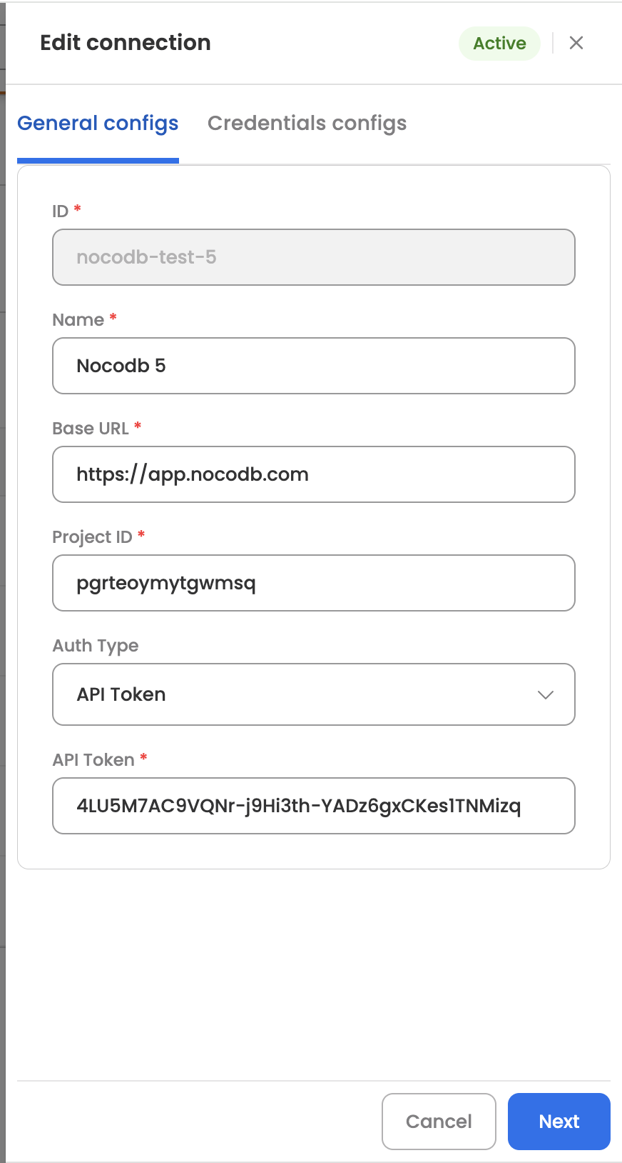 - Base URL: Your NocoDB instance URL (e.g., https://your-instance.nocodb.com)
